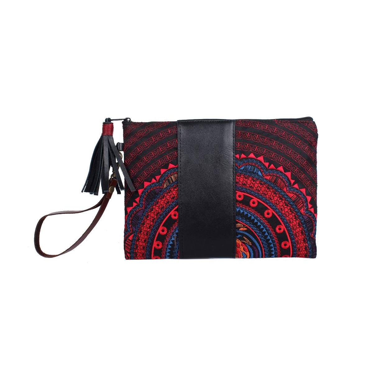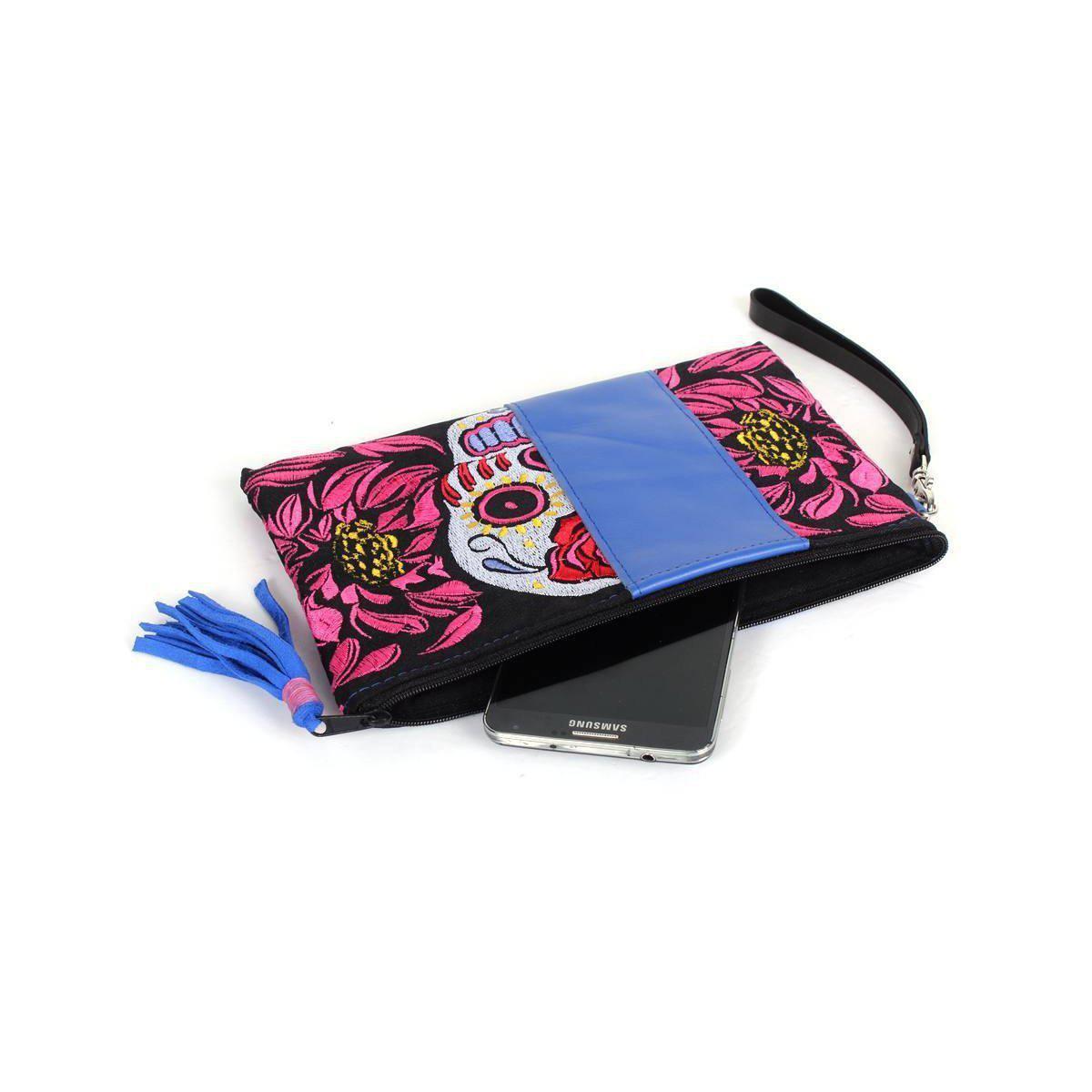 Our Sugar Skull and Tribal wristlet / clutch is perfect for a night out! The zipper closure is decorated with a skull and pom pom decoration. Wrist strap is a comfortable 6" in length. Fully lined with an inside zip pocket. Hand crafted in Northern Thailand.