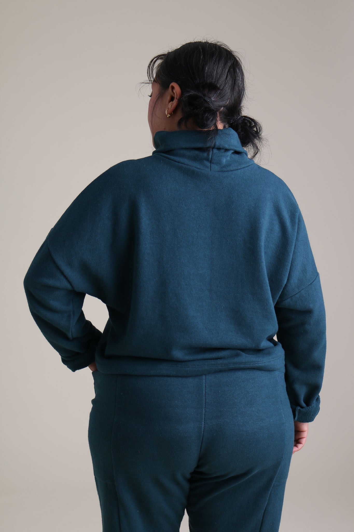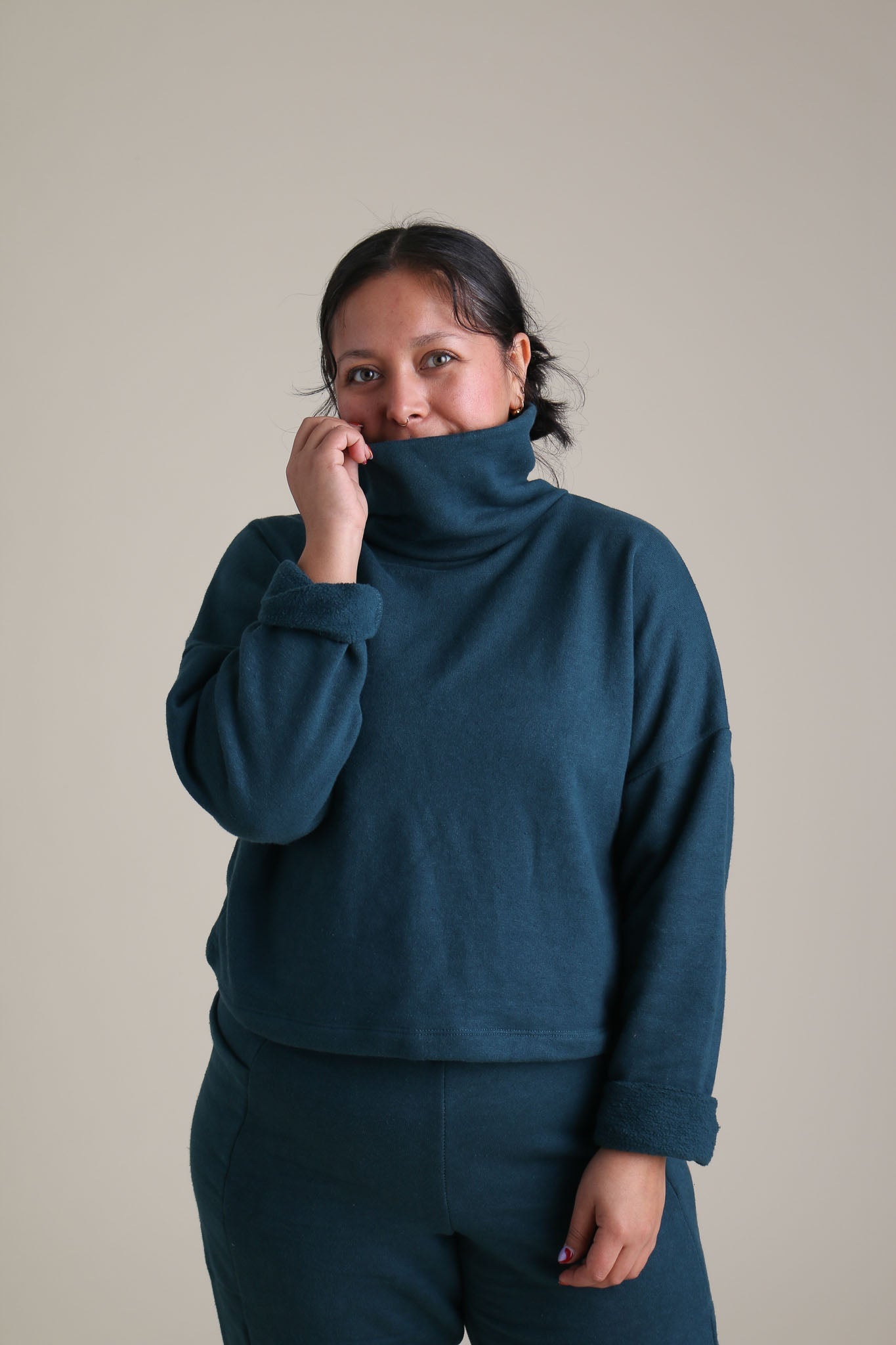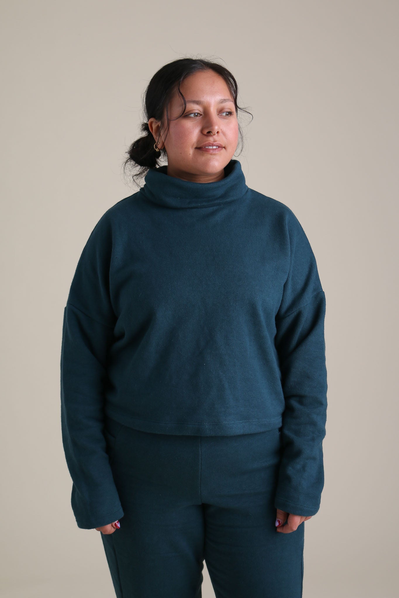 Made from a soft, sustainable blend of hemp and organic cotton fleece, the Summit Top offers breathable warmth and all-day comfort. The boxy fit and cozy cowl neck make it perfect for layering—whether you're hiking to the summit or relaxing by the fire.