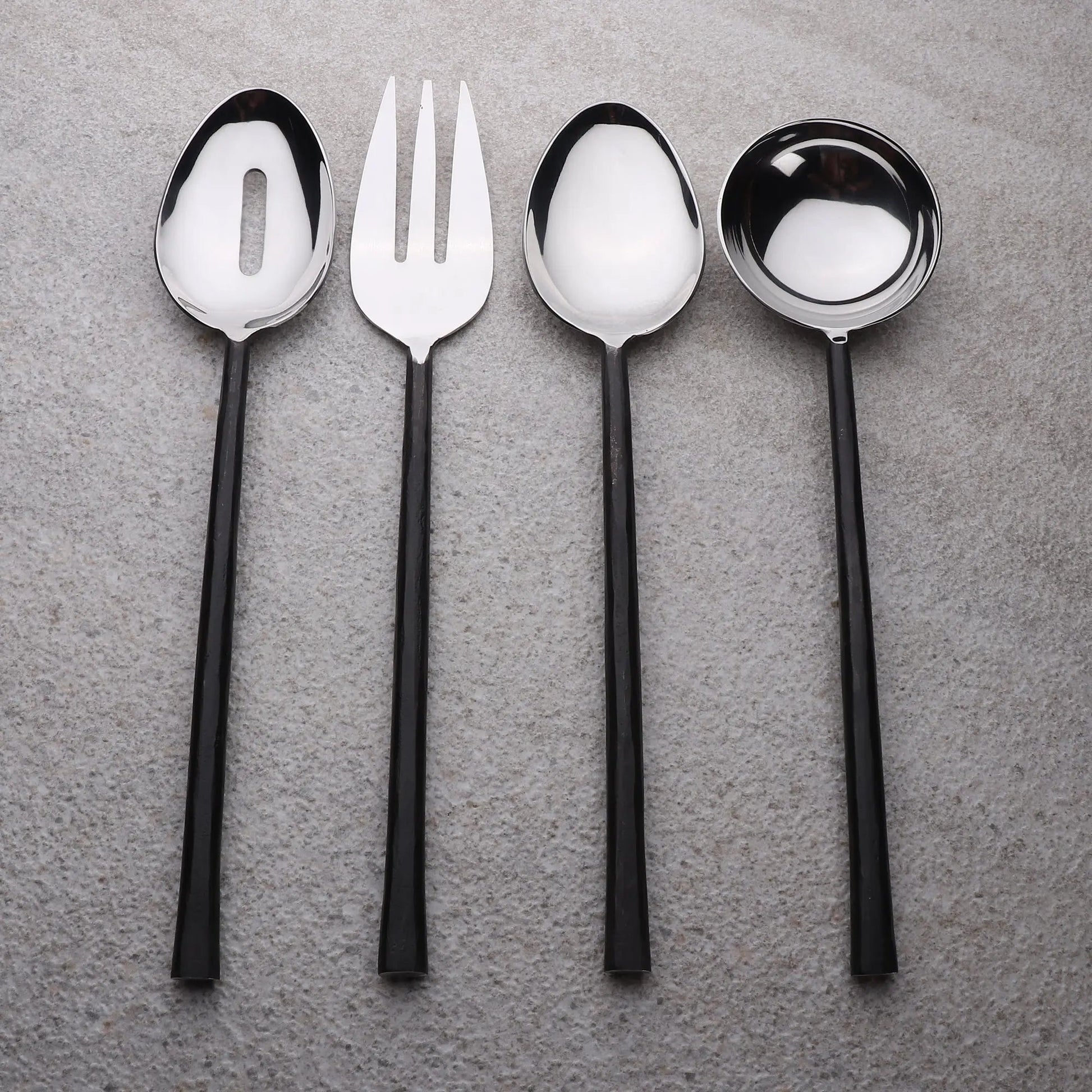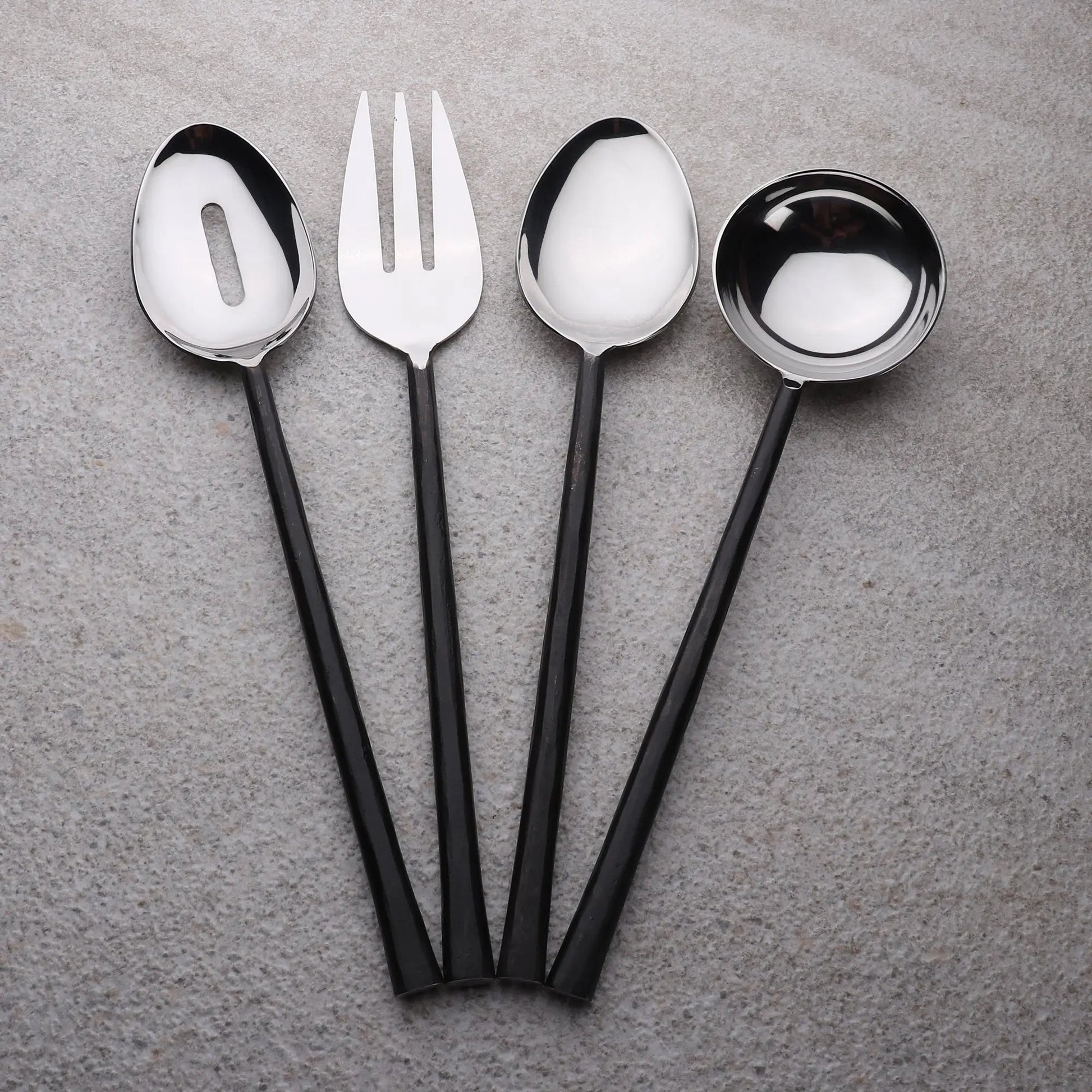 • Each set includes: 1 three-pronged fork, 1 slotted spoon, 1 serving spoon, and 1 sauce/soup ladle