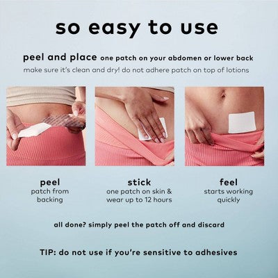 Peel and place one patch on affected area like abdomen or lower back. Patch may be worn up to 8 hours. All done? Simply peel the patch off and discard. Use no more than 3-4 times daily. For ages 12+.