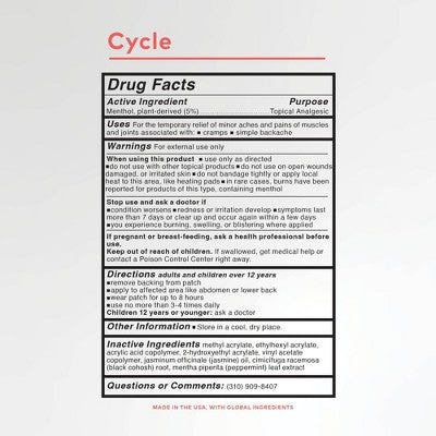Feel the relief with the CYCLE patch from The Good Patch, a wearable wellness patch for that time of the month. Infused with Menthol (5%) and Black Cohosh. This patch offers targeted temporary relief of minor aches and pains associated with that time of the month. Go with the flow all day long with our Cycle patch, made with 4-way stretch, water-resistant technology to withstand short showers, or a long cry sesh, depending on what you need more. With patches, you’re in control of your wellness. Feel good with The Good Patch!