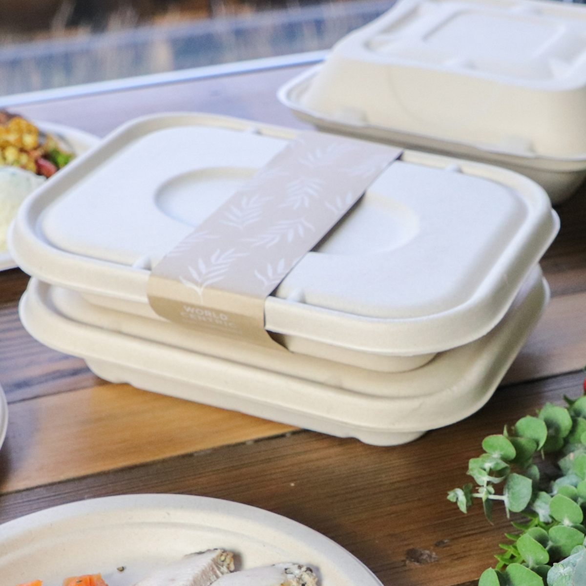 The World Centric® 36 oz Fiber Containers (10×7.5×2") are made from bamboo and unbleached plant fiber — renewable resources that offer a durable and sustainable alternative to plastic and foam. Perfect for both hot and cold foods, these containers are freezer safe, grease- and moisture-resistant, and contain no added PFAS.