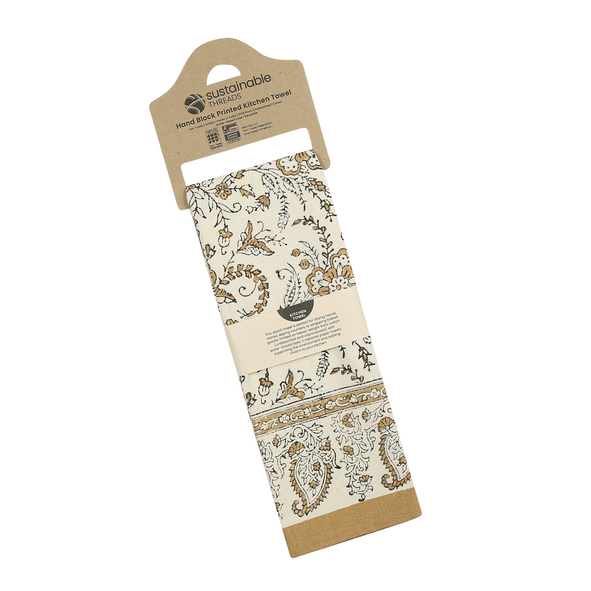 Timeless Technique, Thoughtful Impact Bring artistry and purpose into your kitchen with our hand block printed towel — a beautiful blend of tradition, sustainability, and meaningful craftsmanship. Made from 100% Kora cotton (unprocessed and unbleached), this towel is naturally absorbent, machine washable, and reusable, offering an eco-conscious alternative to disposable paper towels. Crafted by traditional artisans who migrated to the city in search of better livelihoods, these Kitchen towels support not only their families but also preserve the cultural legacy of hand block printing. Designed to be both beautiful and functional, this piece brings heritage into the heart of your home. FEATURES • Size: 27" x 19" – Generously sized for kitchen and home use • 100% Kora Cotton – Raw, unbleached, unprocessed and untreated cotton by chemical bleaches. • Hand Block Printed – Crafted using age-old techniques • Thoughtful Design – Includes a loop for easy hanging and storage • Safer for You & the Planet – Printed with low-impact, eco-friendly dyes • Easy Care – Machine wash cold on delicate; tumble dry low • Meaningful Impact – Created by a displaced community in Northern India, supporting livelihoods • Versatile & Gift-Ready – Ideal for everyday use, environmentally mindful gifting, and special occasions like Thanksgiving, Christmas, Easter, weddings, and housewarmings Disclaimer: Due to the handmade nature of this product and variations in device screens, slight differences in color and craftsmanship may occur. These are not flaws, but the signature of authentic, hand-crafted work.