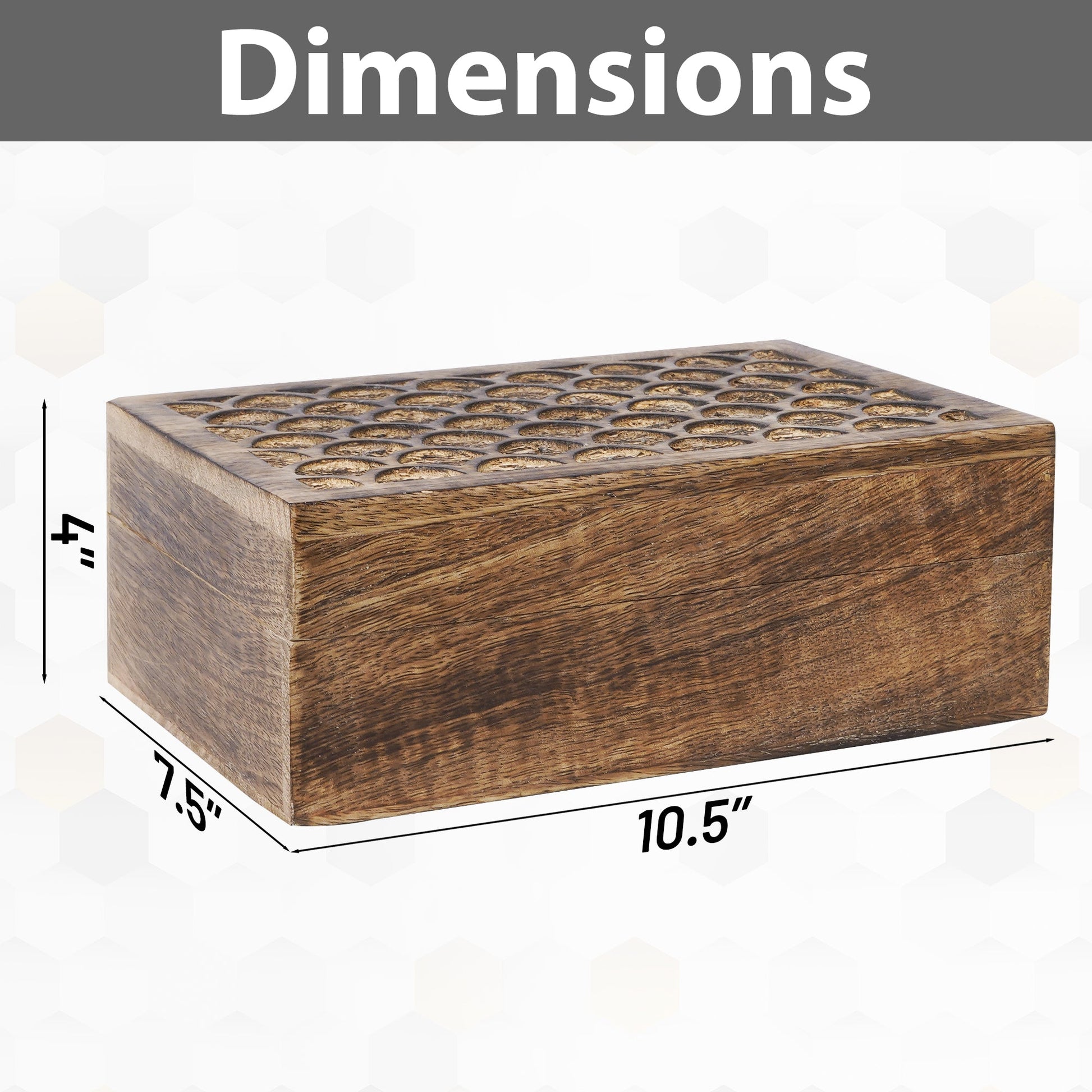 Our wood storage box adds sophistication to your room. We’ve built our home storage boxes to be strong, durable, and scratch-proof. These decorative boxes for home decor are handcrafted from natural Mango wood to ensure longevity and functionality, featuring a beautifully handmade flower design on the lid. The wooden jewelry box for women and men features quality craftsmanship from the creative hands of our Indian Artisans. The intricate hand carving on the lids of these wooden boxes for centerpieces adds a sophisticated charm to your living space. Our decorative wooden gift box is perfectly sized for your needs. The wooden box medium size is an easy and stylish way to organize and stash away your mail, keepsakes, jewelry, and assorted accessories! --- About Us: All Mela Artisans products support fair trade through an extensive program that preserves Indian craftsmanship and promotes the welfare of communities throughout the country. We are so confident in the quality of our products that we offer a no questions asked, money-back guarantee.