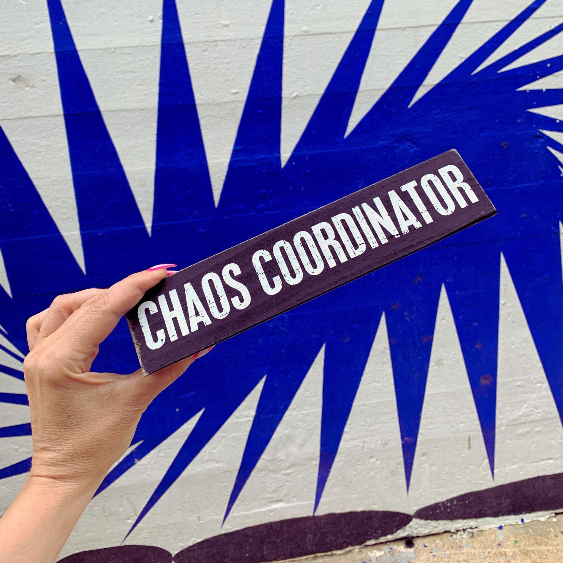A humorous take on a desktop name plate, this double-sided wooden plate features "Chaos Coordinator" and "Director Of Sarcasm" sentiments in classic box sign style.