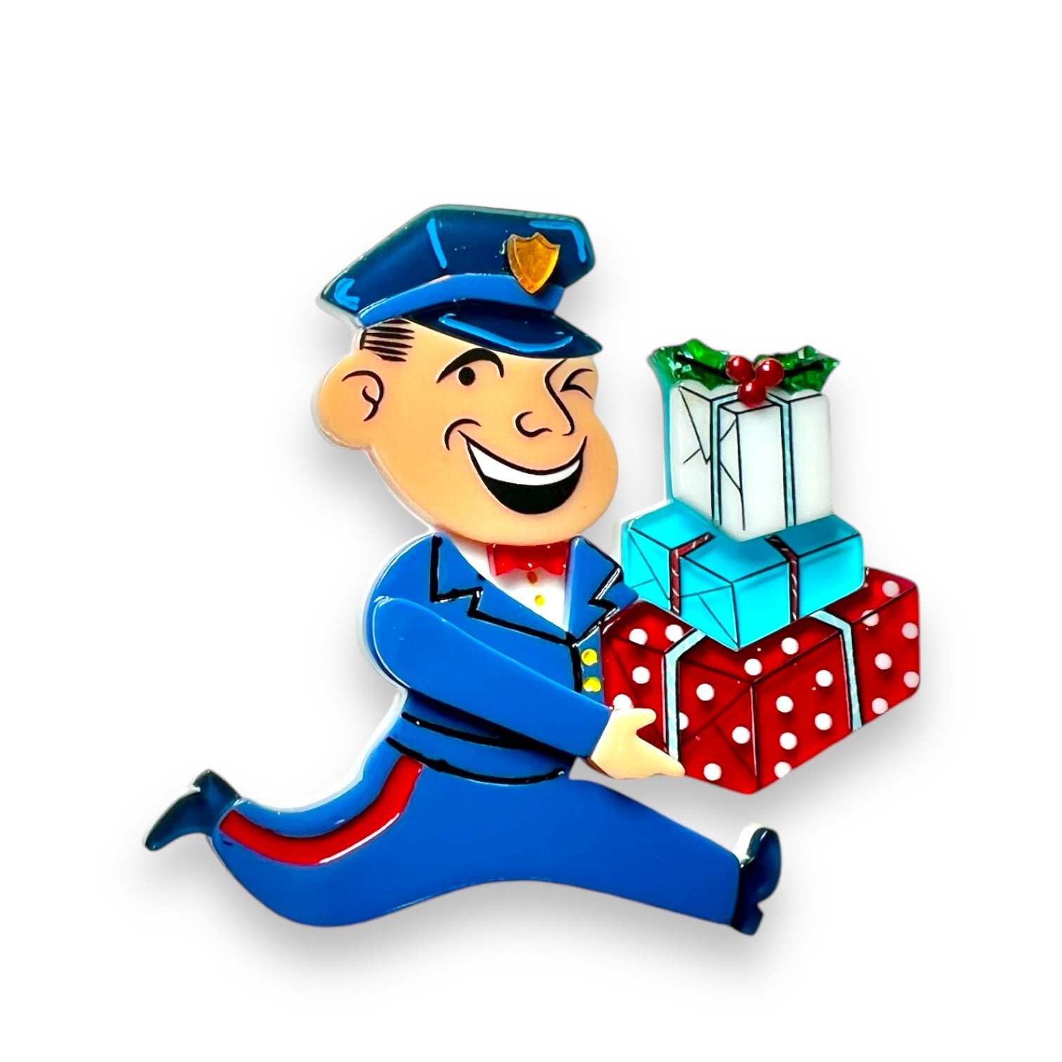Welcome the holiday season with the Christmas Happy Mail Brooch by 50's Vintage Dame x Lipstick & Chrome! This adorable brooch, illustrated by 50s Vintage Dame, depicts a festive delivery man bringing you some extra holiday cheer. Made of durable acrylic material, this brooch is the perfect accessory to add some Christmas spirit to any outfit. Don't miss the matching earrings!