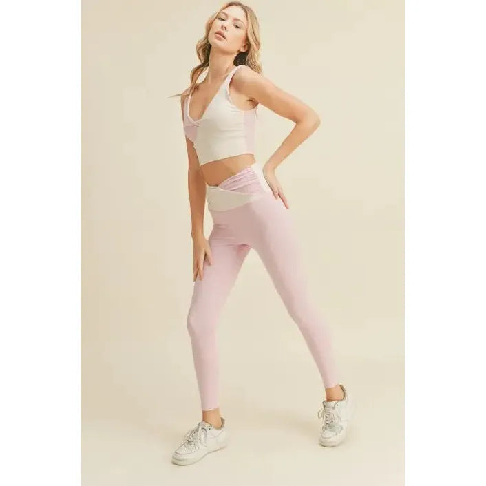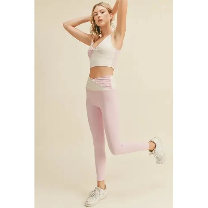 Color Block Front-Twist Set. Featuring a stylish front-twist crop top and high-rise color block leggings, this two-piece is built for both form and function.