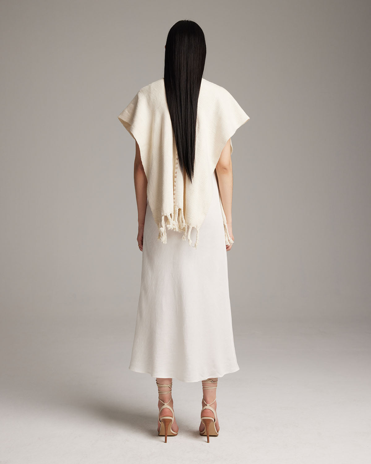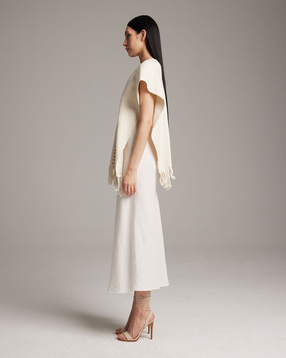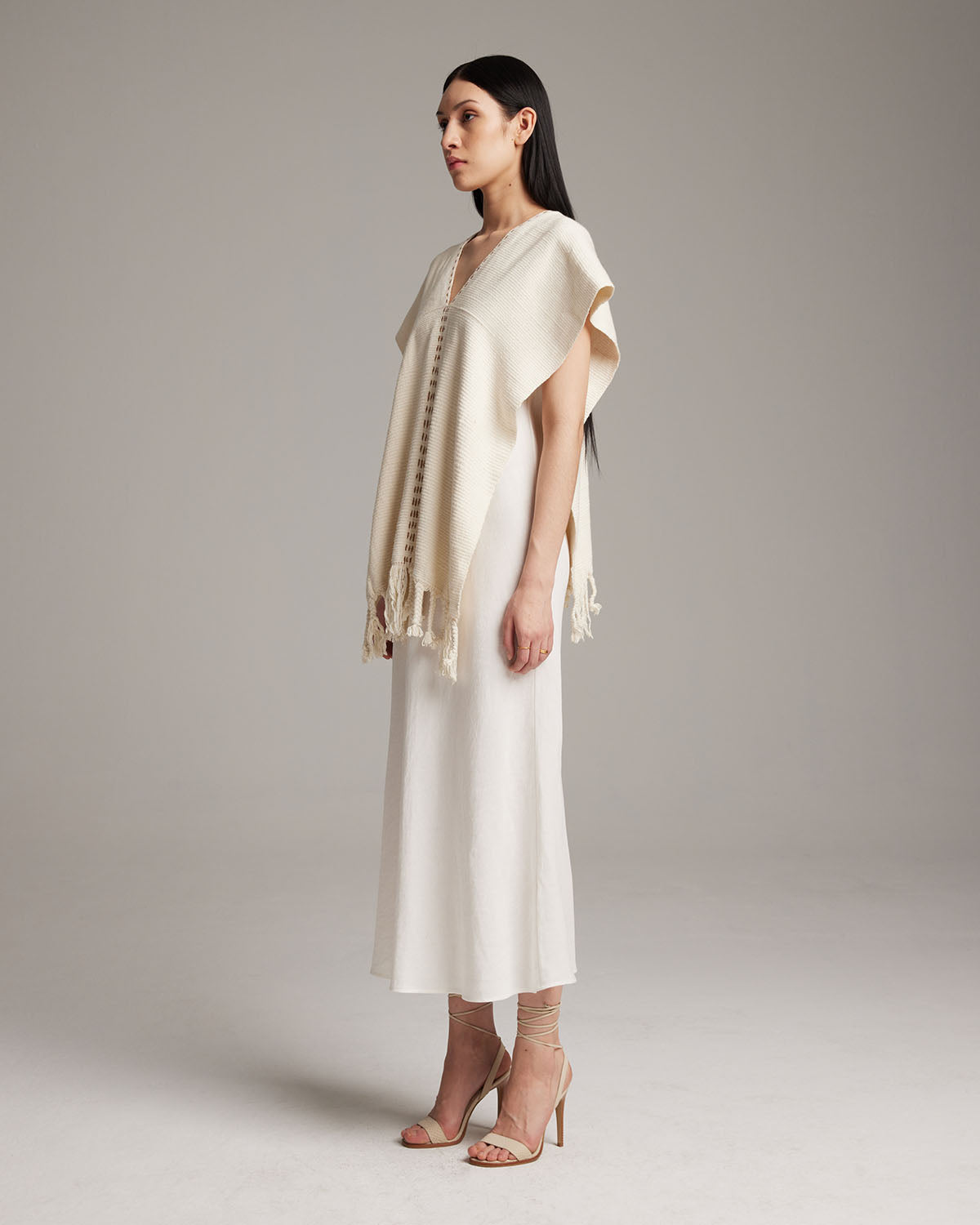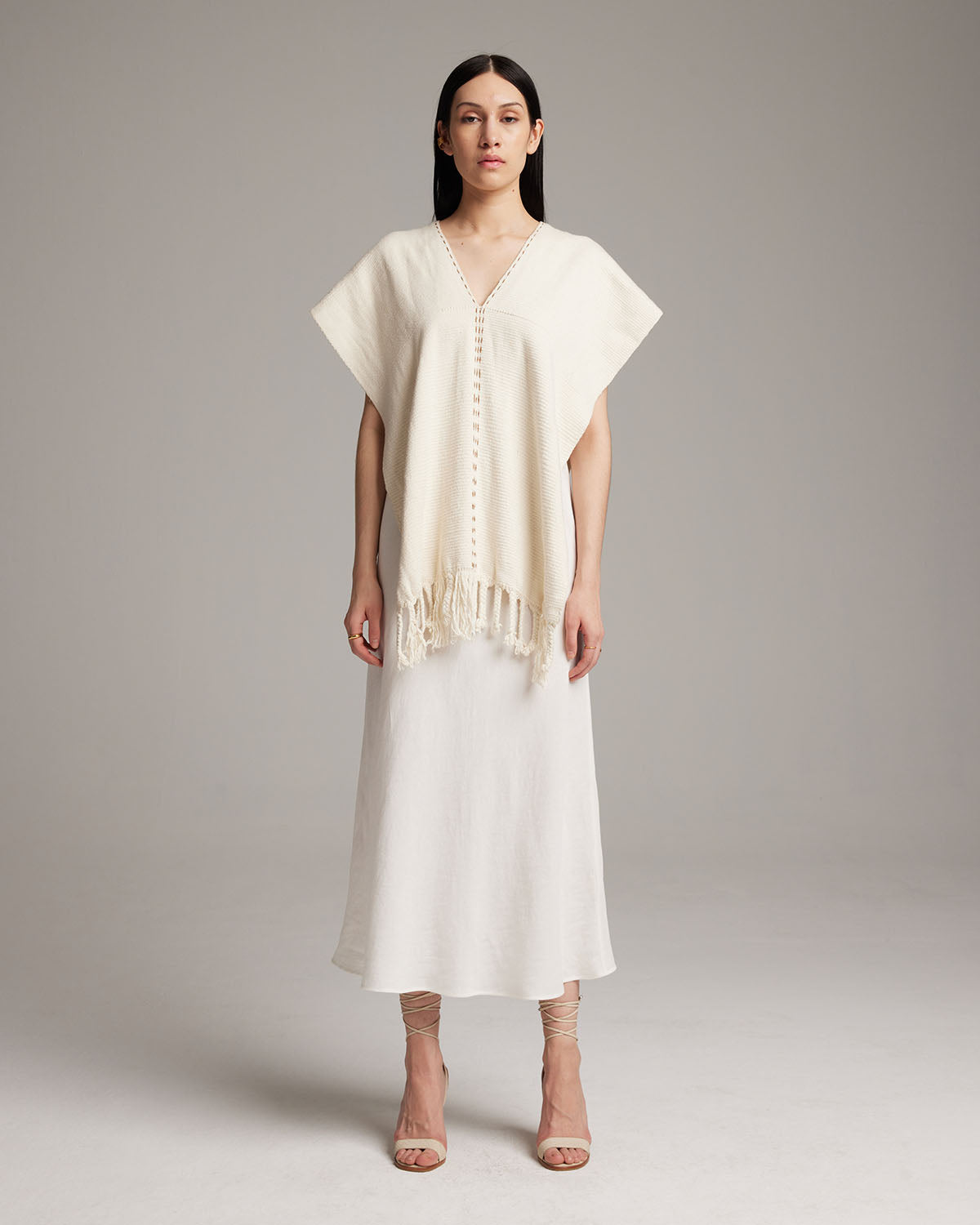 Hand-loomed 100% organic cotton with fringe detail. Features copper and ivory threaded detail down the center.