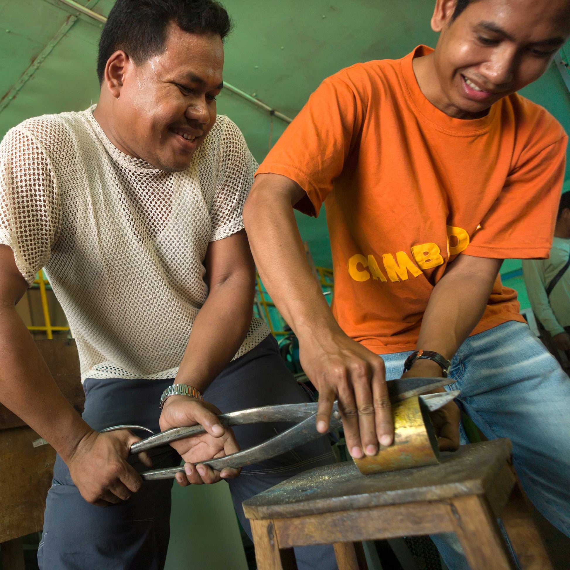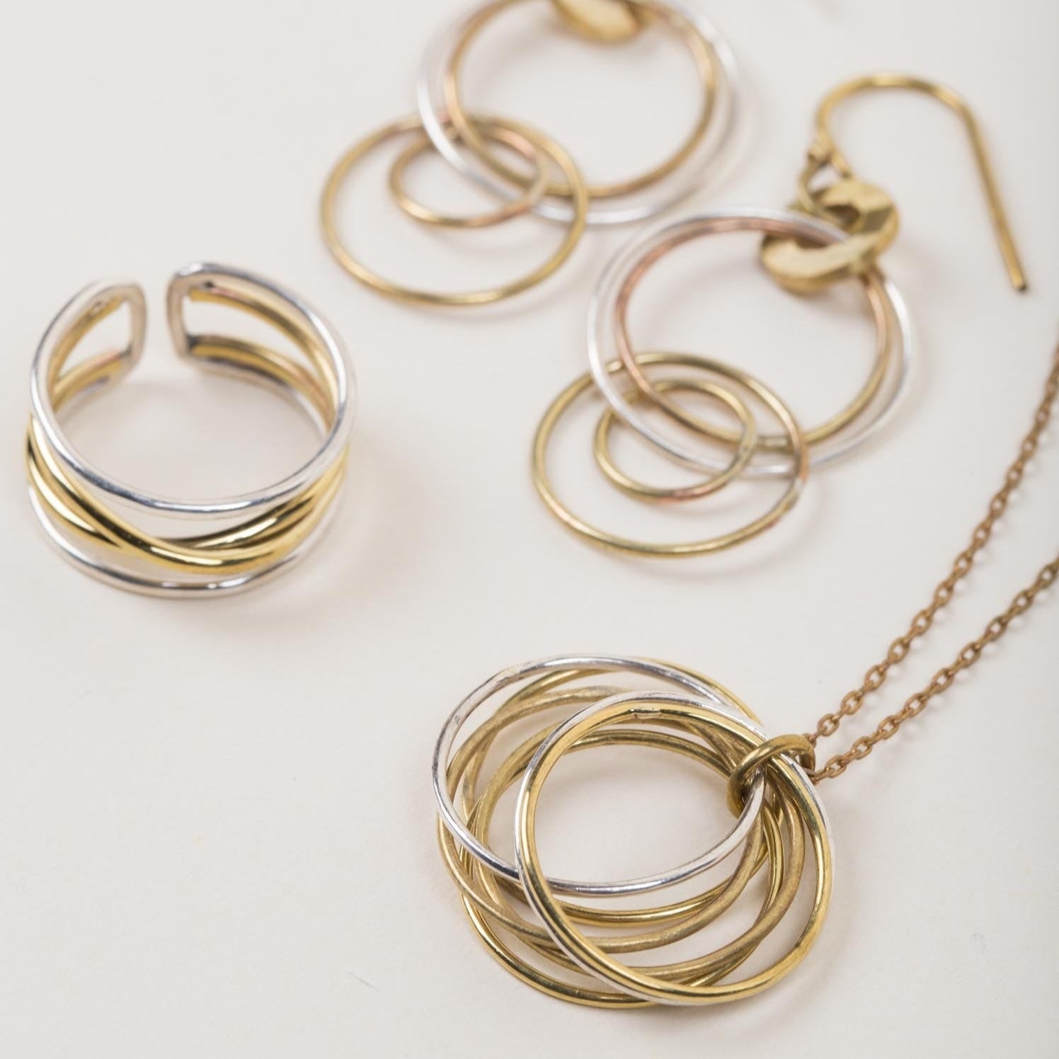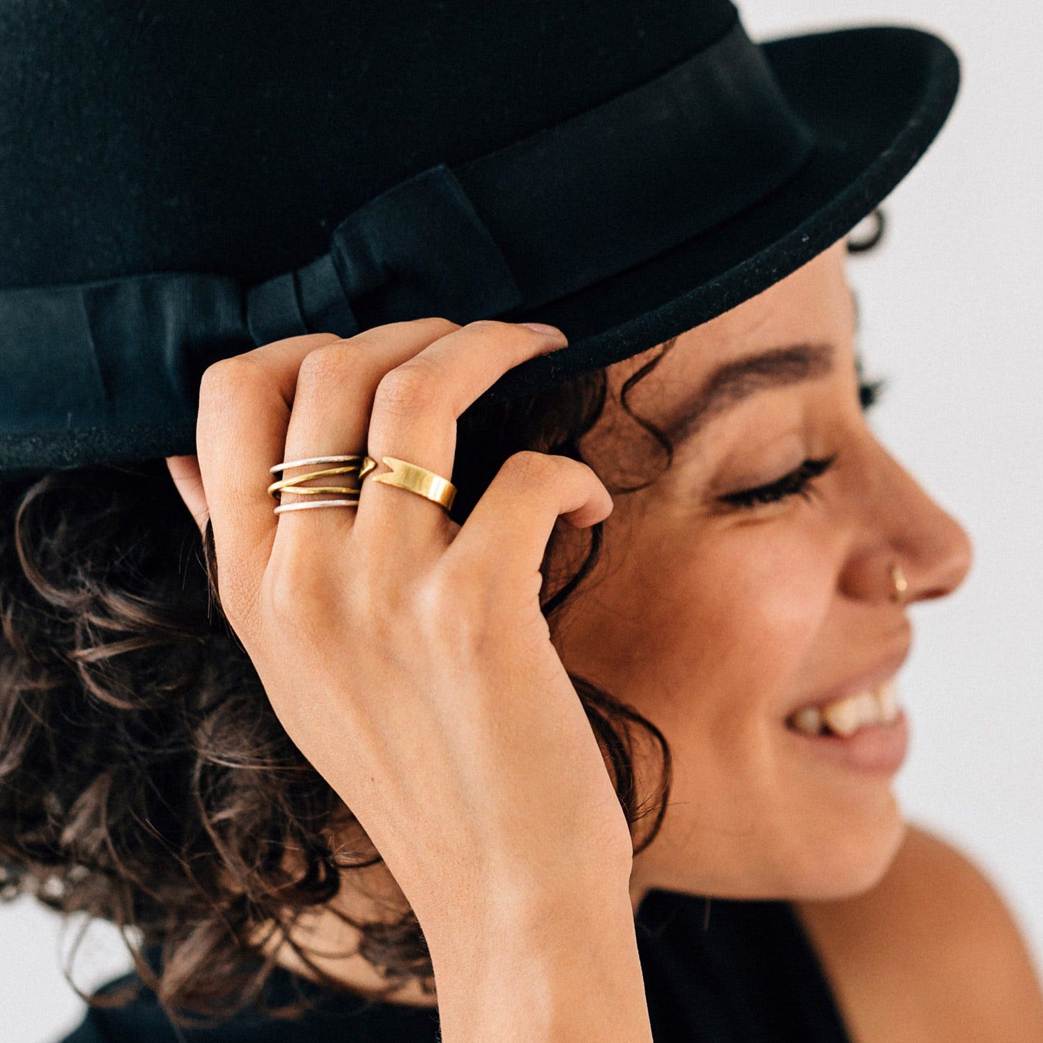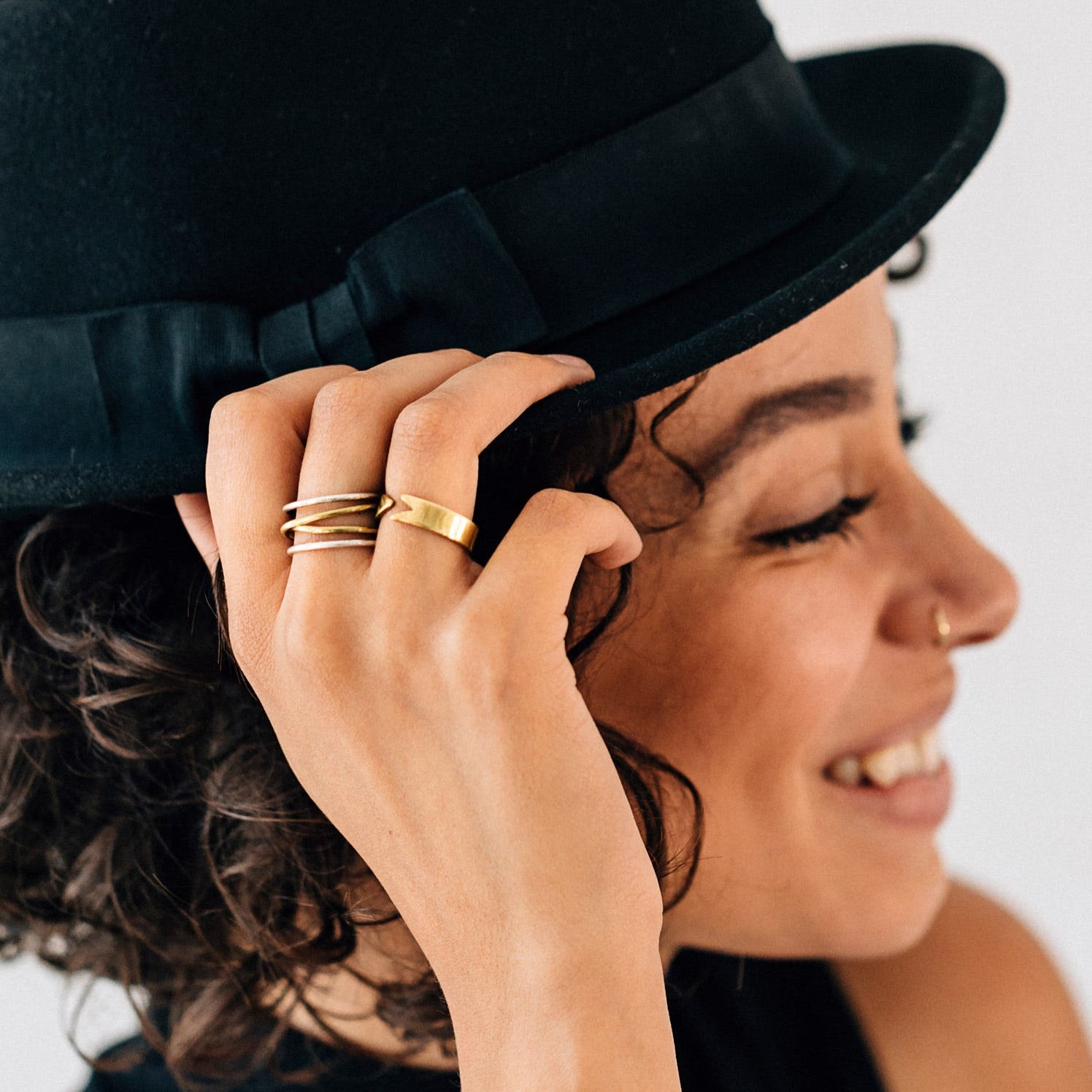 Bands of sterling silver and upcycled brass from bomb casings intertwine in this symbolic ring from Cambodia. Decades of conflict have left the Cambodian countryside littered with bombs—some still dangerous, all a reminder of violence. One by one, the makers of Rajana cut and shape brass bomb casings, safely cleared by a demining agency, into jewelry — wearable statements of peace and progress. Featuring an open band, the Crossed Paths Ring is size adjustable.