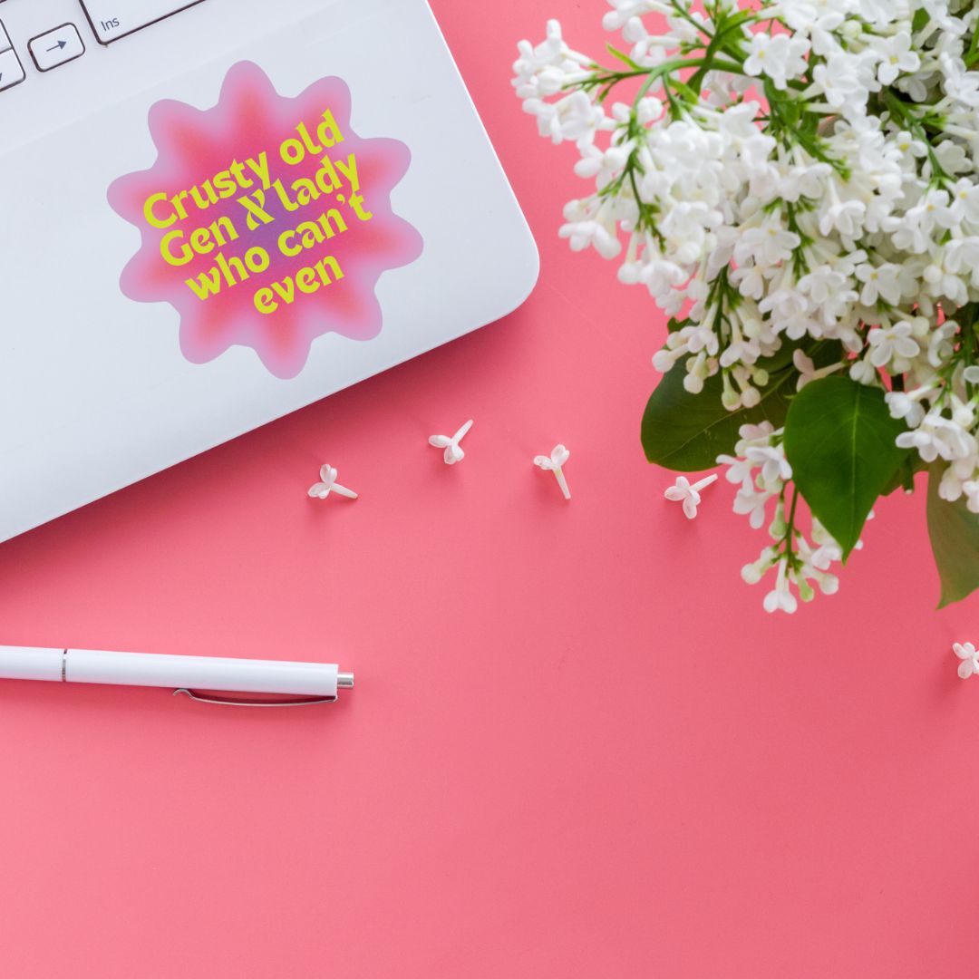 Crusty Old Gen X Lady Who Can't Even Glossy Die Cut Vinyl Sticker 2.95in x 2.83in