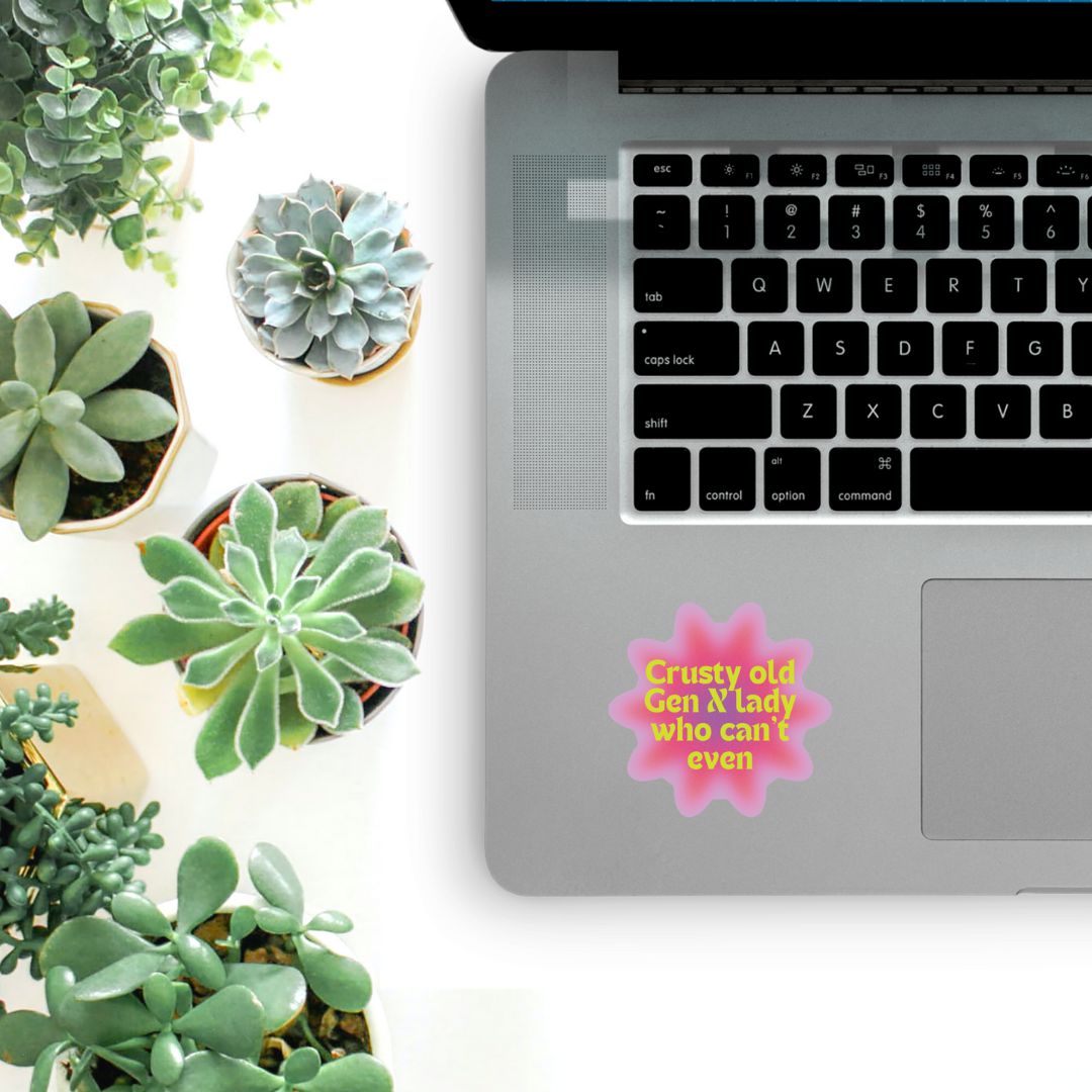 Add a touch of Gen X attitude to your laptop, water bottle, or bike with the Crusty Old Gen X Lady Who Can't Even glossy die cut vinyl sticker from GetBullish. This 2.95" x 2.83" sticker features a vibrant finish that protects it from UV rays, making it a durable and stylish addition to your accessories or a fun gift for the Gen Xer in your life.