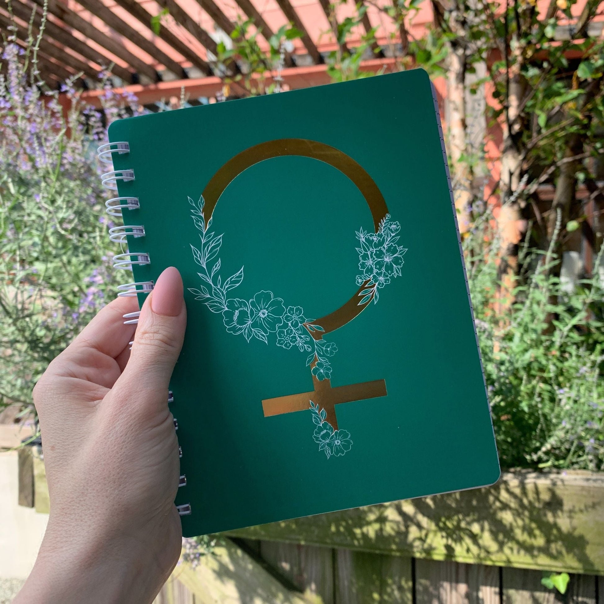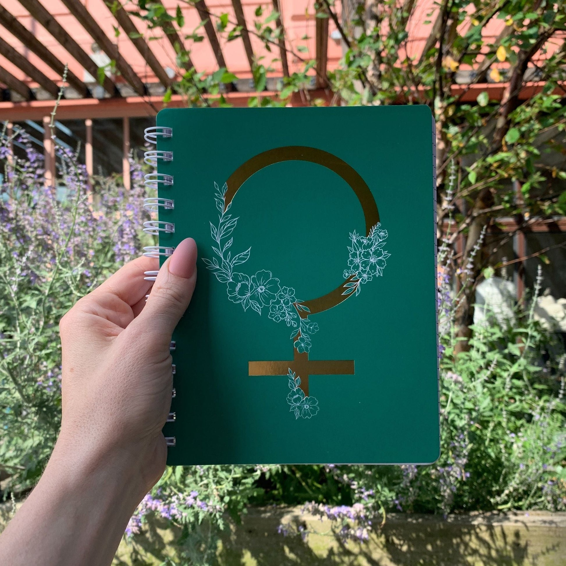 A double-sided spiral notebook displaying a unique design of the female gender symbol with floral accents and metallic foil details. Back cover features inspirational "Darling, You Are Magic" sentiment. Includes 120 lined white pages.