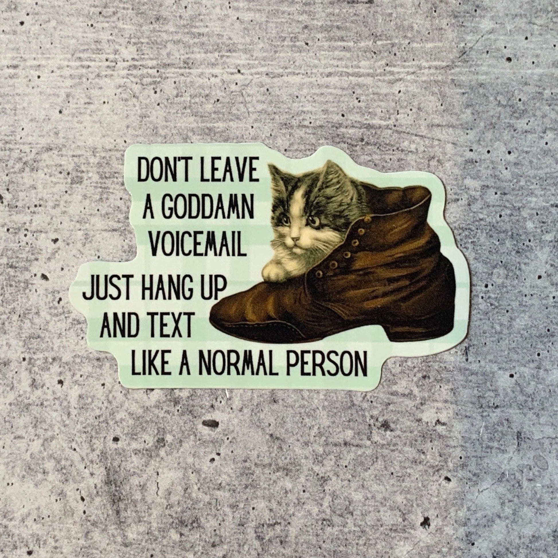 Sticker reads: "Don't leave a goddam voicemail just hang up and text like a normal person."