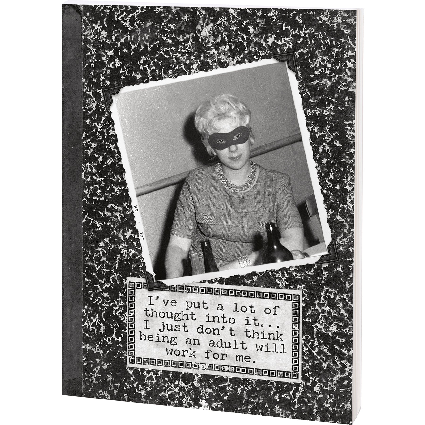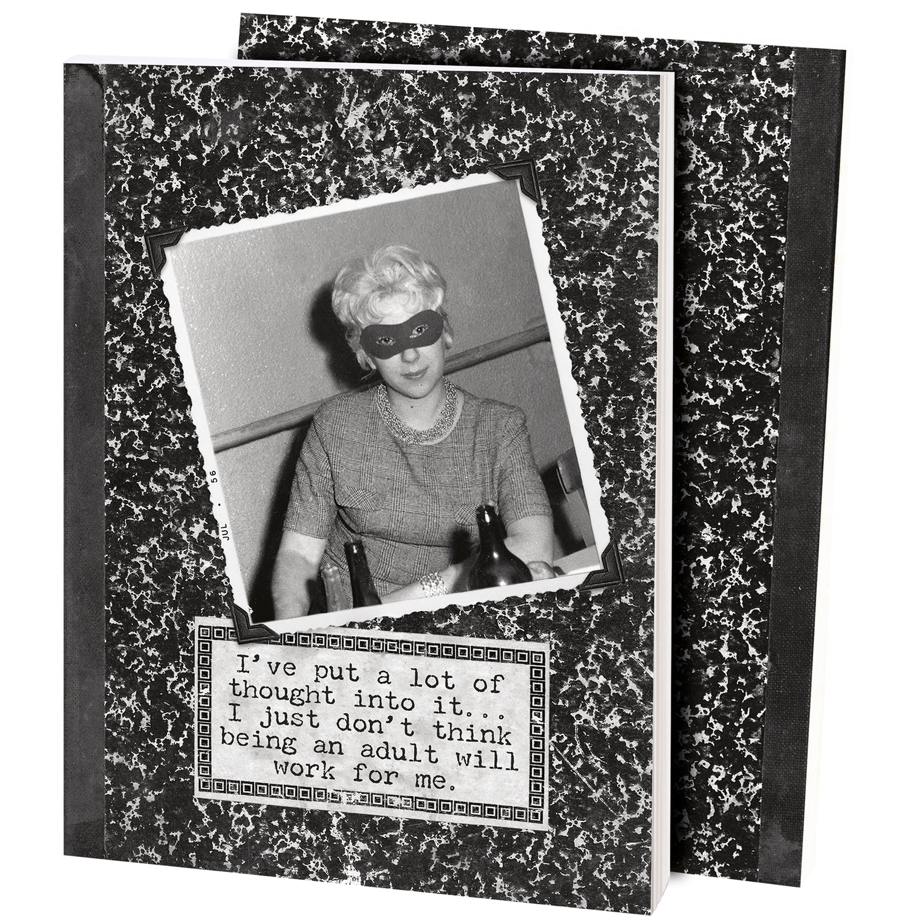 A double-sided journal featuring vintage photography and "I've Put A Lot Of Thought Into It…I Just Don't Think Being An Adult Will Work For Me." sentiment.