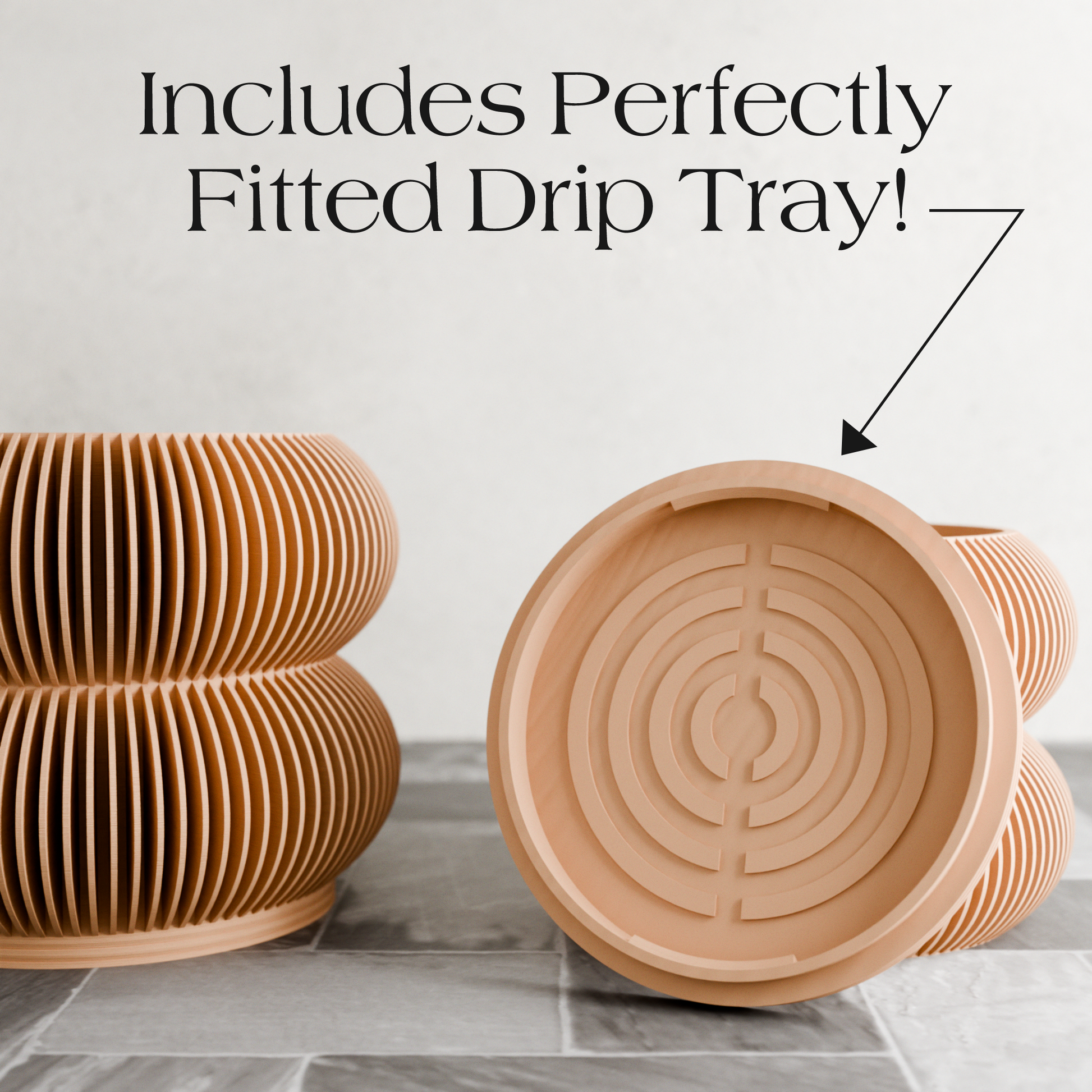 Sizes: Large: Height: 6.3 inches | Width: 8 inches Medium: Height: 4.7 inches | Width: 6 inches Small: Height: 3.17 inches | Width: 4 inches Looking for something custom? Feel free to reach out for personalized sizes or colors. Modernized design We designed the Double BUBBLES planter to bring a sense of playful elegance to your home, combining modern form with soft, flowing curves. Its unique, ribbed structure and stacked design create a bold yet refined look, making it the perfect statement piece to showcase your plants in style. The drip tray/saucer is custom-fitted and designed to perfectly complement the planter. Made from 98% Plant-Based Materials | BioPlastic & Wood Fibers