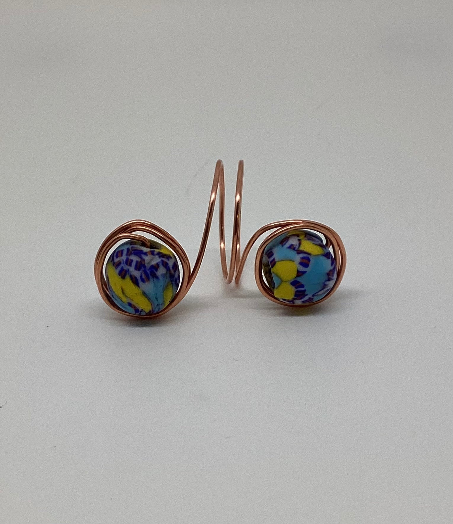 Made with copper wire and recycled glass beads.