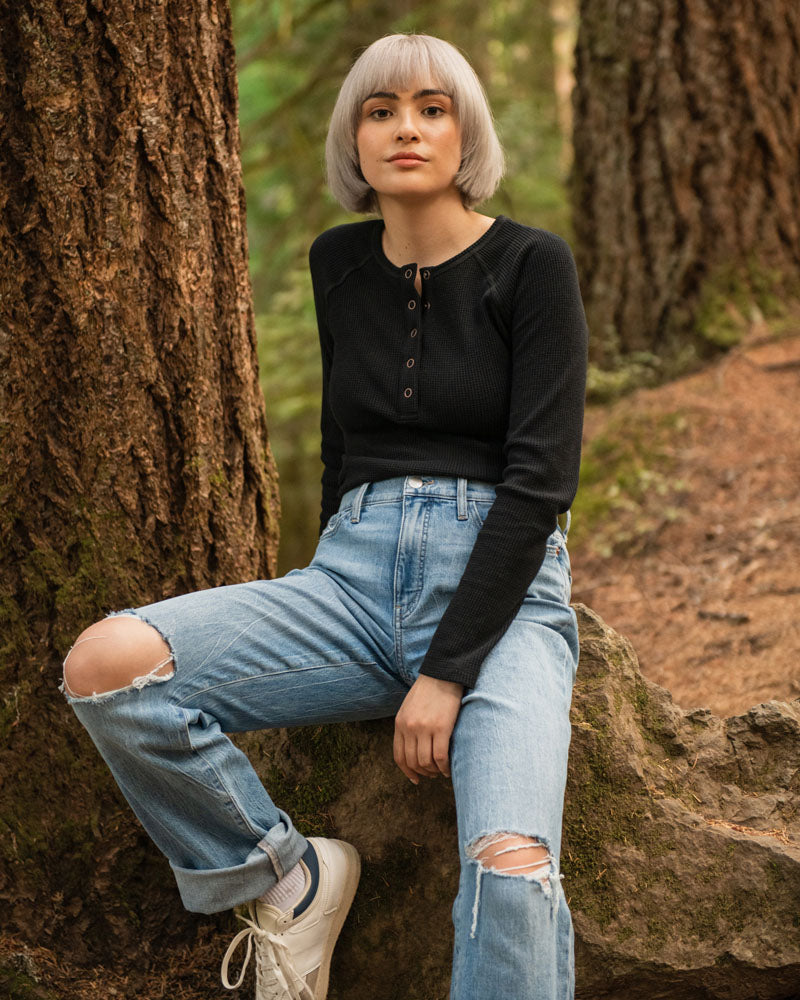 - Slim fit, long-sleeve henley with contrast fabric and ring snaps at placket.