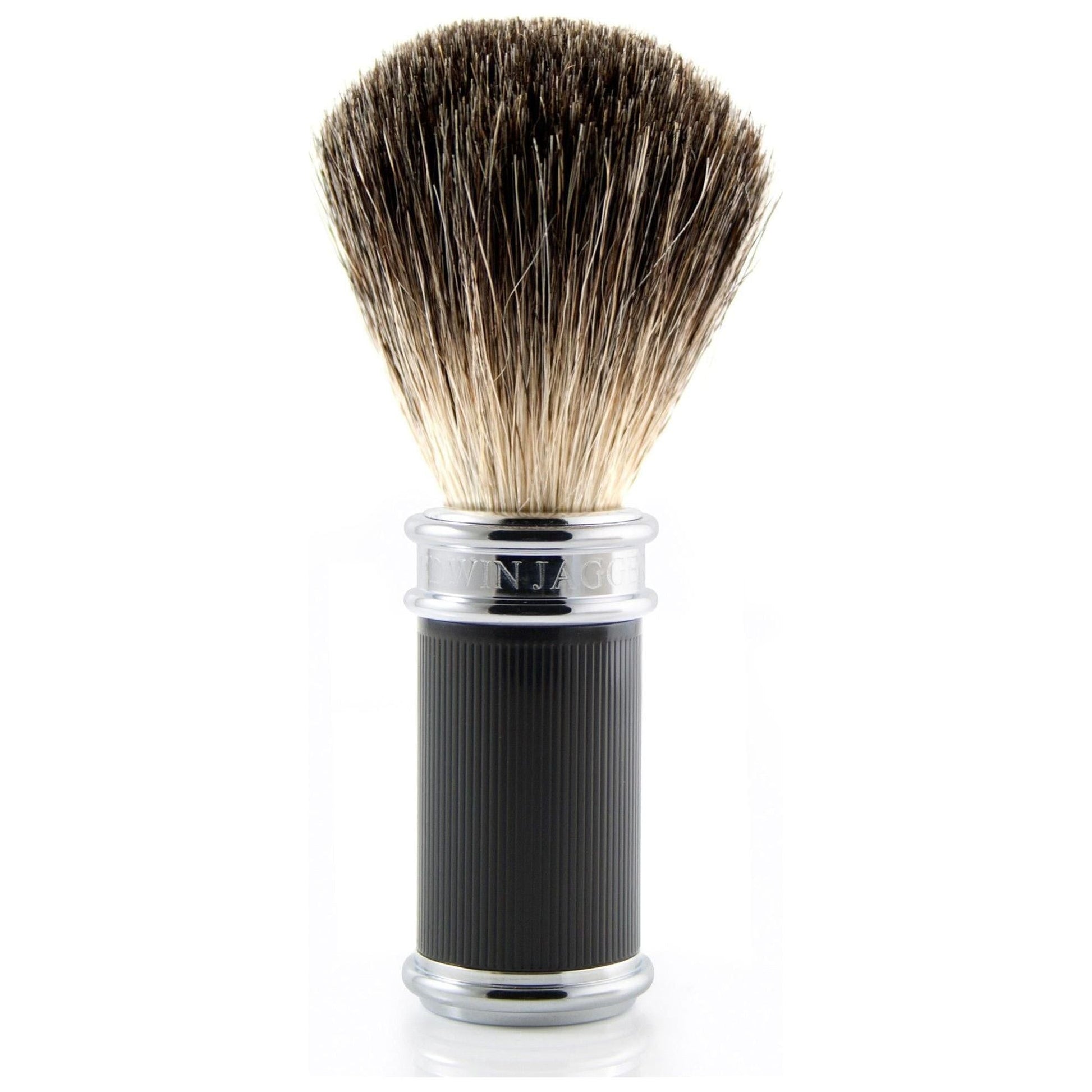 Smart pure badger shaving brush with black moulded plastic handle and Edwin Jagger logo. An excellent value for money brush will give a new or experienced shaver the chance to try a badger shaving brush. without it costing top dollar.