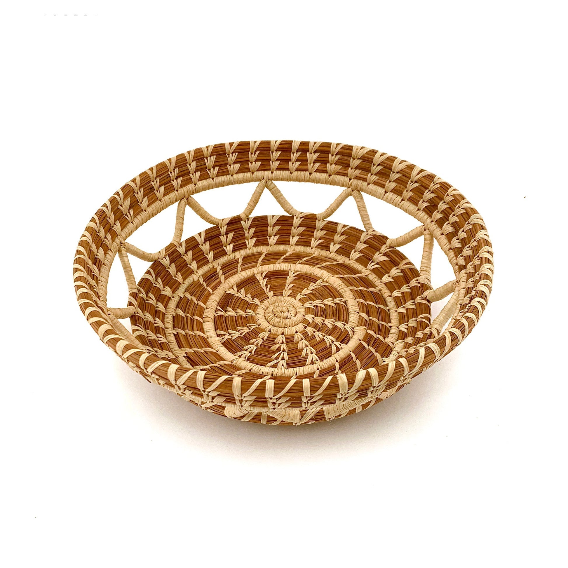The Elena basket's handcrafted open-work detail allows its contents to peak through to become part of the design. Filled with fruit as a functional bowl or displayed as decoration, this basket is perfect for any table. Pine needles and raffia 9" diameter x 2.75" high
