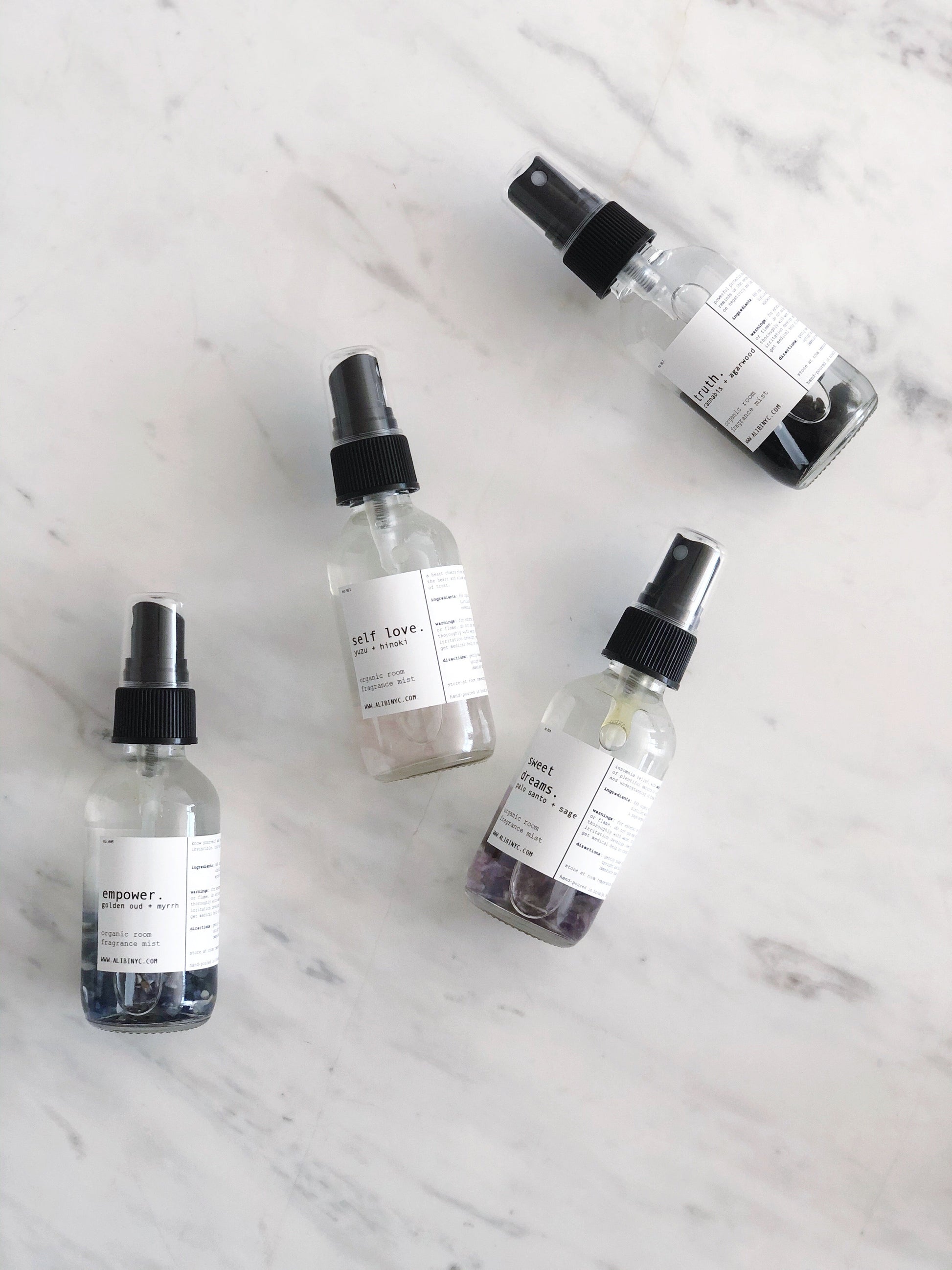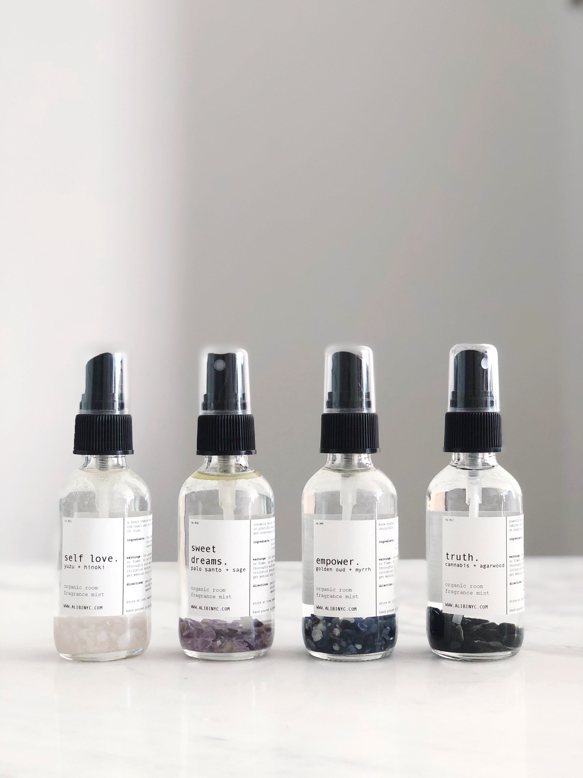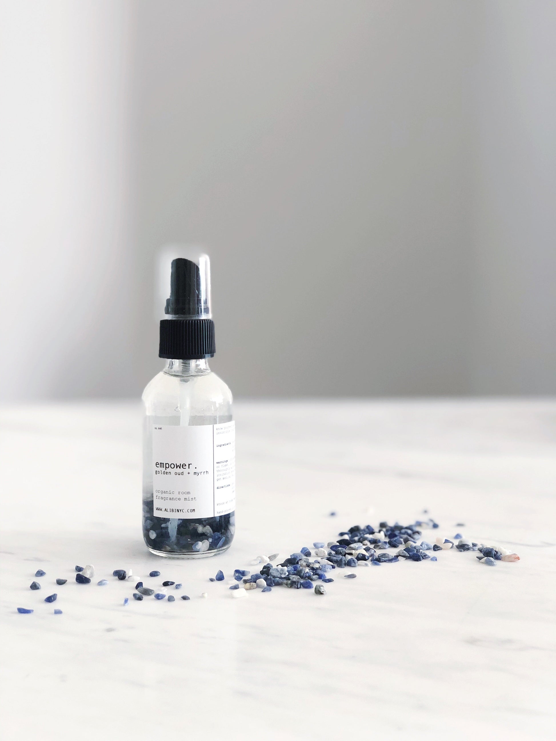 Our EMPOWER spray is made with organic witch hazel infused with Golden Oud + Myrrh essential oils, combined with natural sodalite.