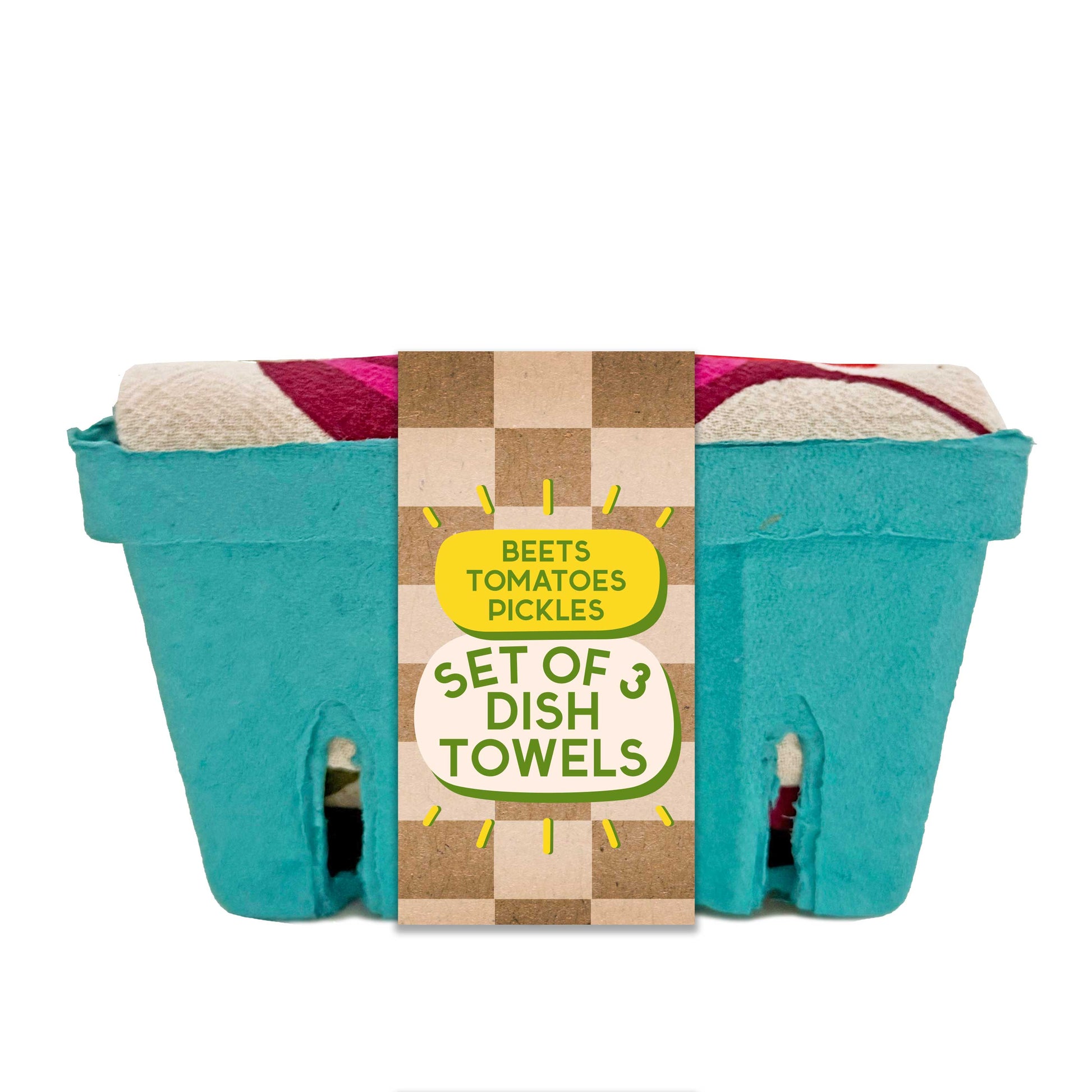 Brighten your kitchen with our Farmer's Market Towel Set, featuring three of our signature 100% cotton dish towels: Tomato, Beet, and Dill Pickle. Bundled in a gift-ready, biodegradable produce container and topped with our sleek NEW branded belly band, this set is as cute as it is practical. Made from all natural, unbleached cotton and screen-printed with eco-friendly inks, these towels are soft, absorbent, machine washable, and gentle on the planet. They’ll add personality to any kitchen and bring you a smile. Perfect for holiday gifting, birthdays, housewarmings, and more! They also make adorable (and sustainable) gift wrap too. ----------------------------- • Set comes in a 5.5" x 5.5" x 3" quart produce container • Container is compostable and biodegradable • Each towel measures approx. 24" x 26" (size tolerance 2–3") • All natural, unbleached 100% cotton • Machine washable • Screen-printed with eco-friendly, water-based inks • Designed, sewn, printed, and packaged in the USA *Actual color may vary from your monitor.