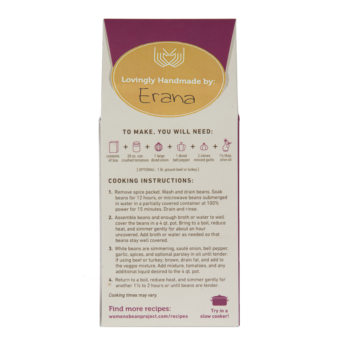 Chili Mix with a kick! Try Women’s Bean Project’s Firehouse #10 Spicy Chili Mix lovingly handmade by a woman in our transitional workforce development program. A hearty meal that serves 7-8, our firehouse chili mix contains a custom spice packet, light red kidney beans, pinto beans and red chili beans.