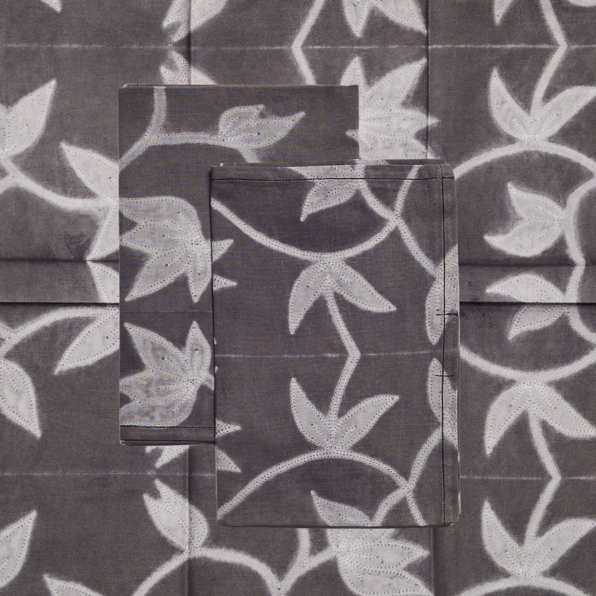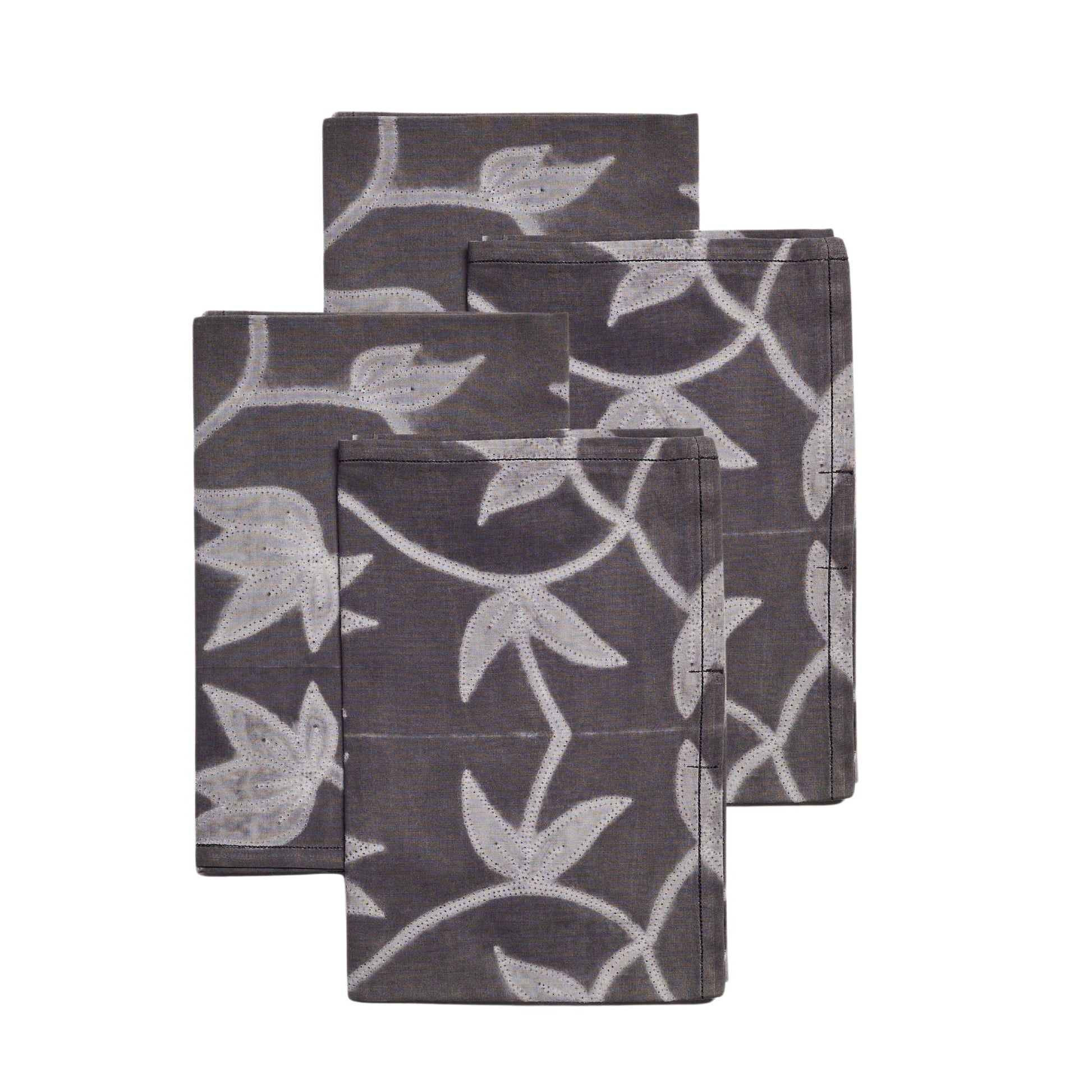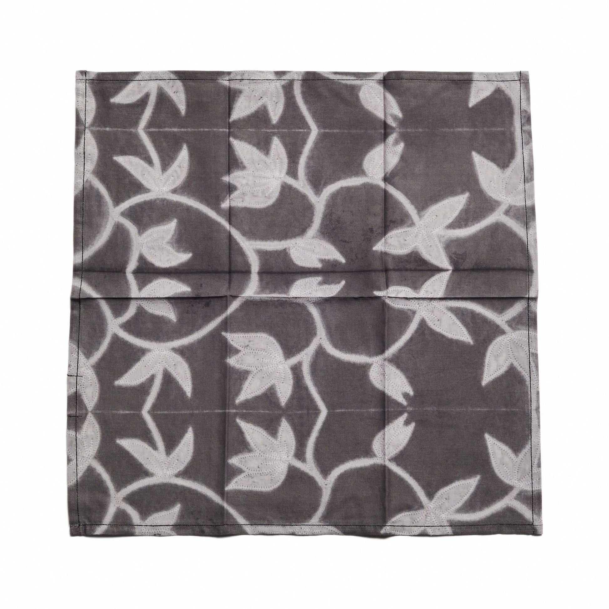 Folio Black table napkin is a unique modern artisanal napkin. Created artistically and ethically by artisans in India using shibori print technique, using only pure natural dyes. It is a pure statement piece that adds modern and timeless quality as a table ware accessory. Classic & timeless in design, Folio napkin in black is a sustainable luxury statement. Created all by hand these napkins are made in small careful batches, each piece being unique as it is completely handcrafted.Natural elements local to the artisan clusters are used to custom create dyes for this production. Each order includes a set of 4 napkins. Material: 60s cotton ( thick ) Size: 18X18" (square) Color: Shibori floral print in indigo. Artisan base: Ethically & responsibly handmade by artisans in India ​Wash care: Gently hand wash separately. Hang dry in cool shaded place. What Makes Your Purchase Sustainable? 100% organic dyes sourced locally and made to order. Support employment of women artisans. 100% handmade manufacturing process by artisans. All pieces are sun dried / air dried to conserve energy. Use only 100% natural + biodegradable responsibly sourced materials. Small batch production ensures higher quality & less wastage.