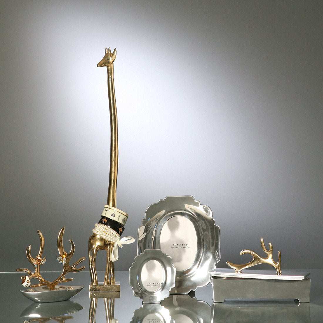 The MODERN FAUNA COLLECTION celebrates the most identifiable characteristics of each animal and exaggerates them. This sculptural collection has the signature rounded and decidedly modernist aesthetic for which Lunares is so well known. The elegant giraffe sculpture with its extra long neck is a whimsical addition to your bookshelves or create a surprising jewelry display by stacking your favorite bracelets on its neck