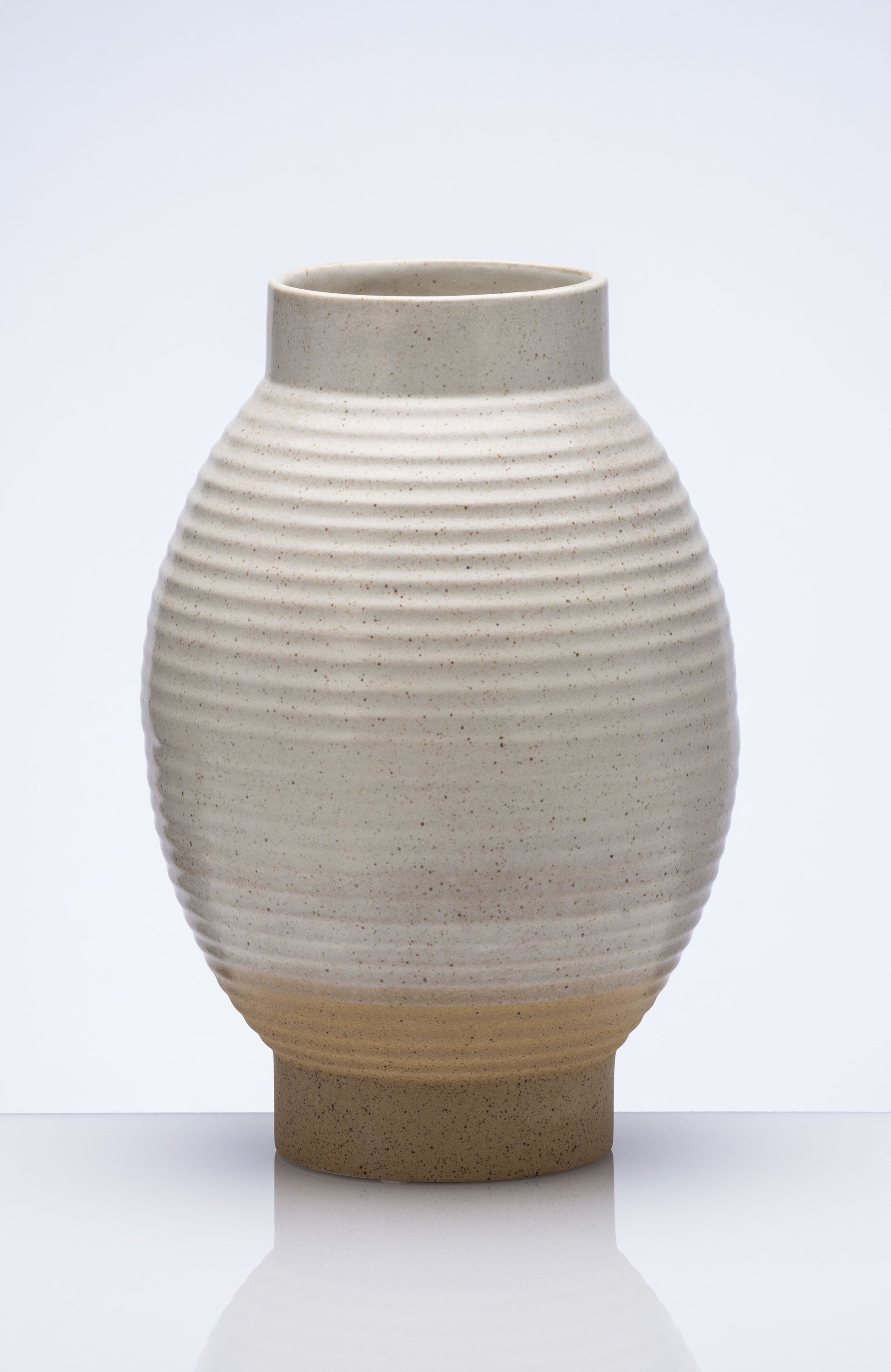 A timeless fusion of texture and contrast, this handcrafted ceramic vase is defined by its ribbed silhouette and organic speckled finish. The glazed upper half offers a smooth, polished contrast to the raw, unglazed base, creating a striking interplay of surfaces. Earthy yet refined, it stands beautifully on its own or styled with botanicals, bringing depth and character to any space. Pair it with its matching tall vase for a cohesive, layered display. Product Details Dimensions: 7.5” Dia x 10.5” H Material: Ceramic Finish: Reactive glaze – due to the nature of the glaze, no two pieces are alike Watertight: Yes Care: Clean gently with soft, dry cloth; use damp if needed (water only) Origin: Ethically and sustainably handcrafted in Portugal