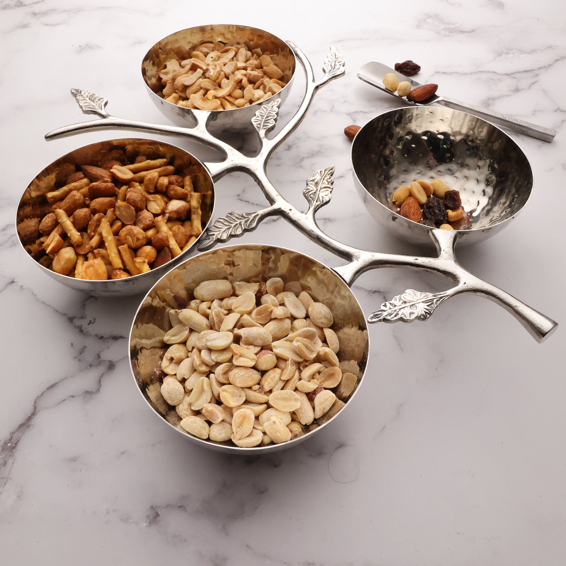 Like berries on the vine, our Hammered Leaf Nut Bowl is an elegant serving caddy. The design features a gleaming silver vine with leaves connecting the four small hammered stainless steel bowls.