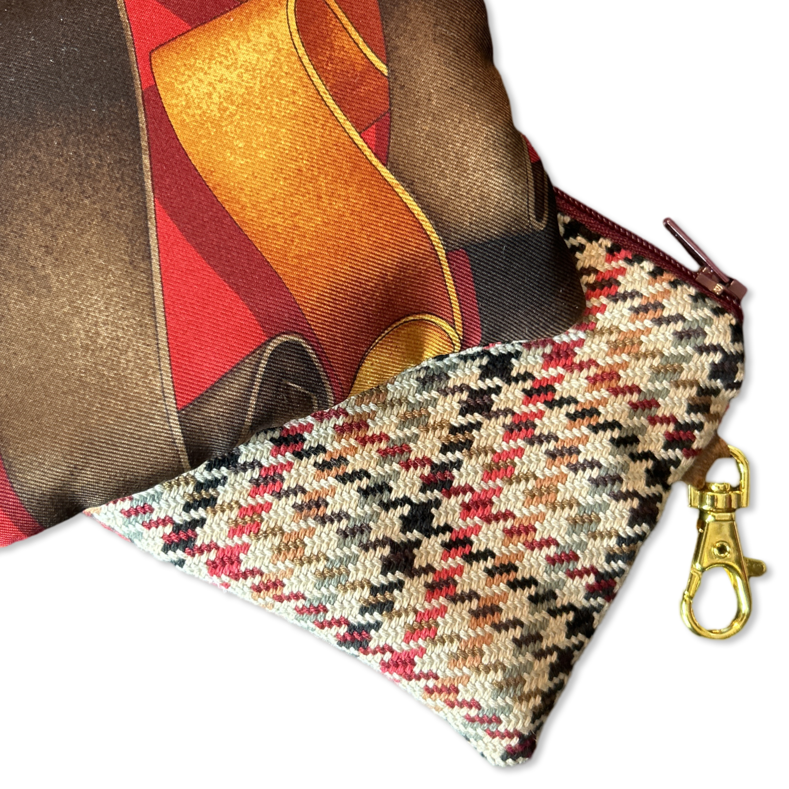 Vintage Gucci 100% silk scarf front with coordinating tweed reverse. Fully lined, zipper closure with removable gold-tone keychain and lobster clasp.