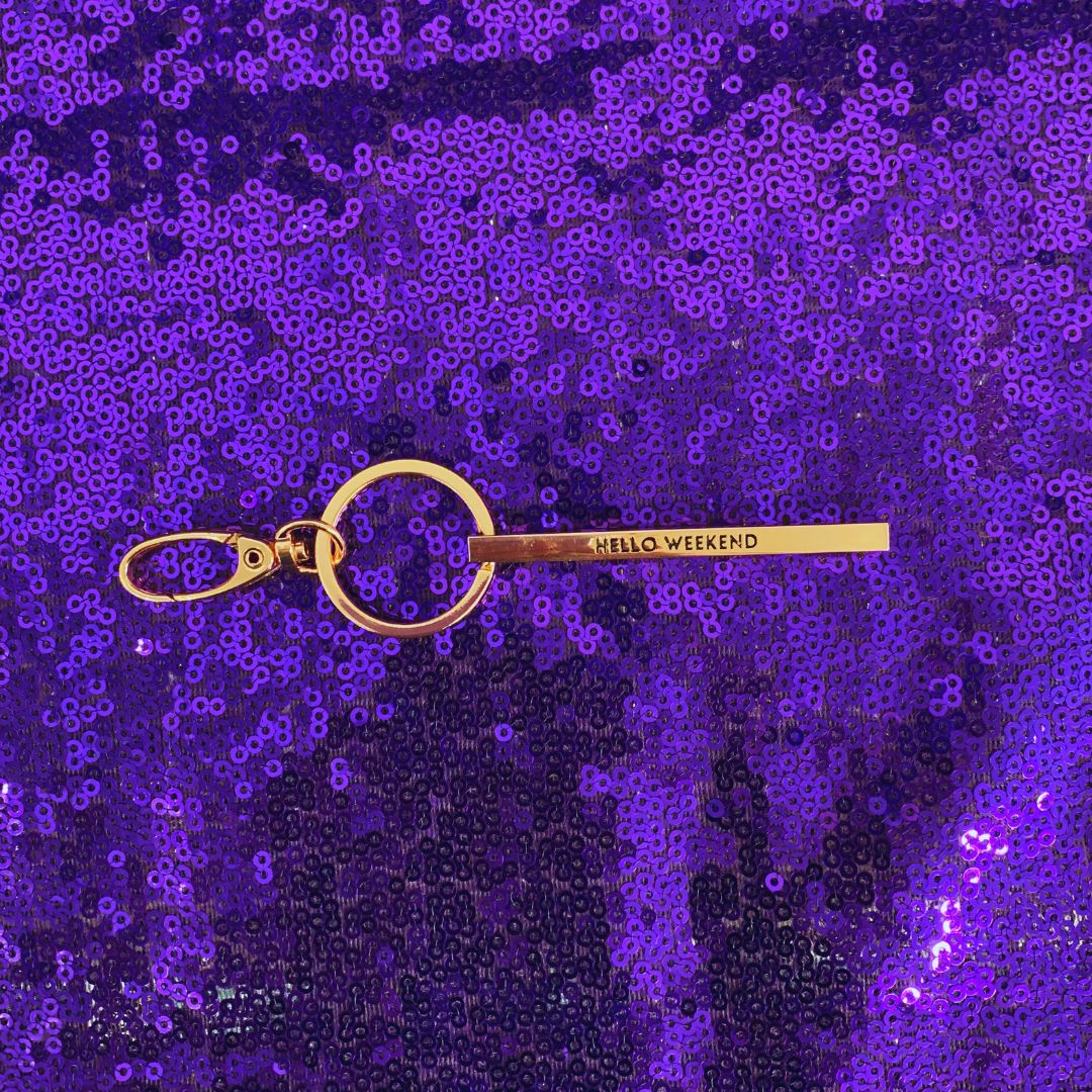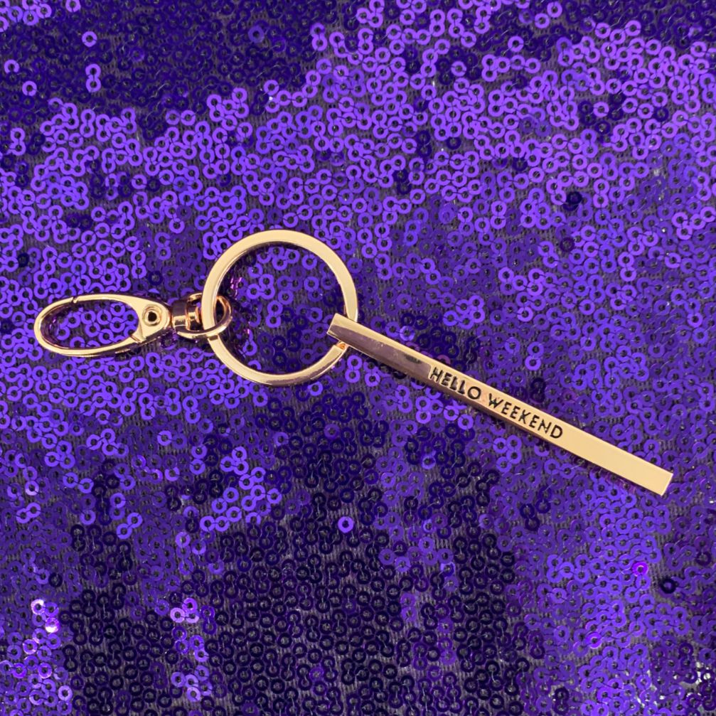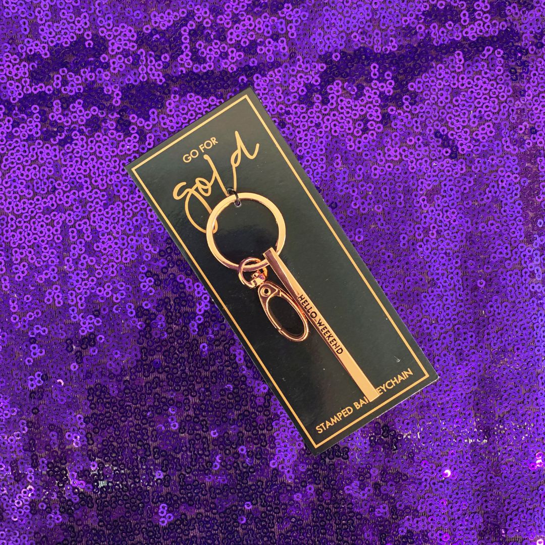 Hello Weekend Stamped Bar Keychain in Rose Gold | Minimalist Metal Quote Keychain