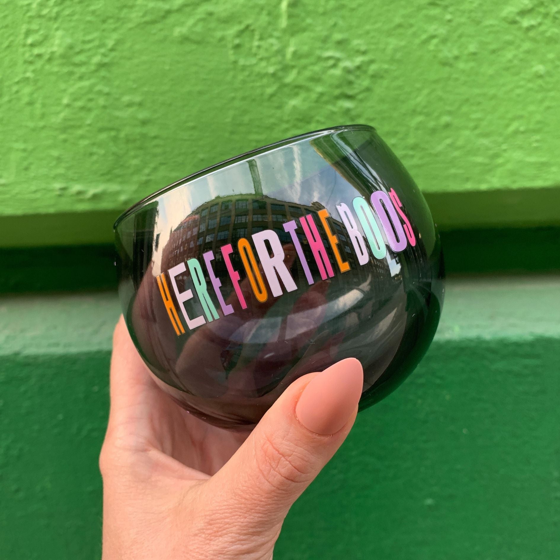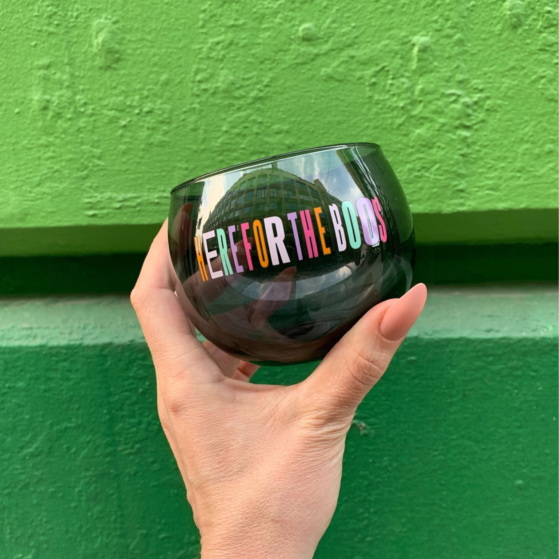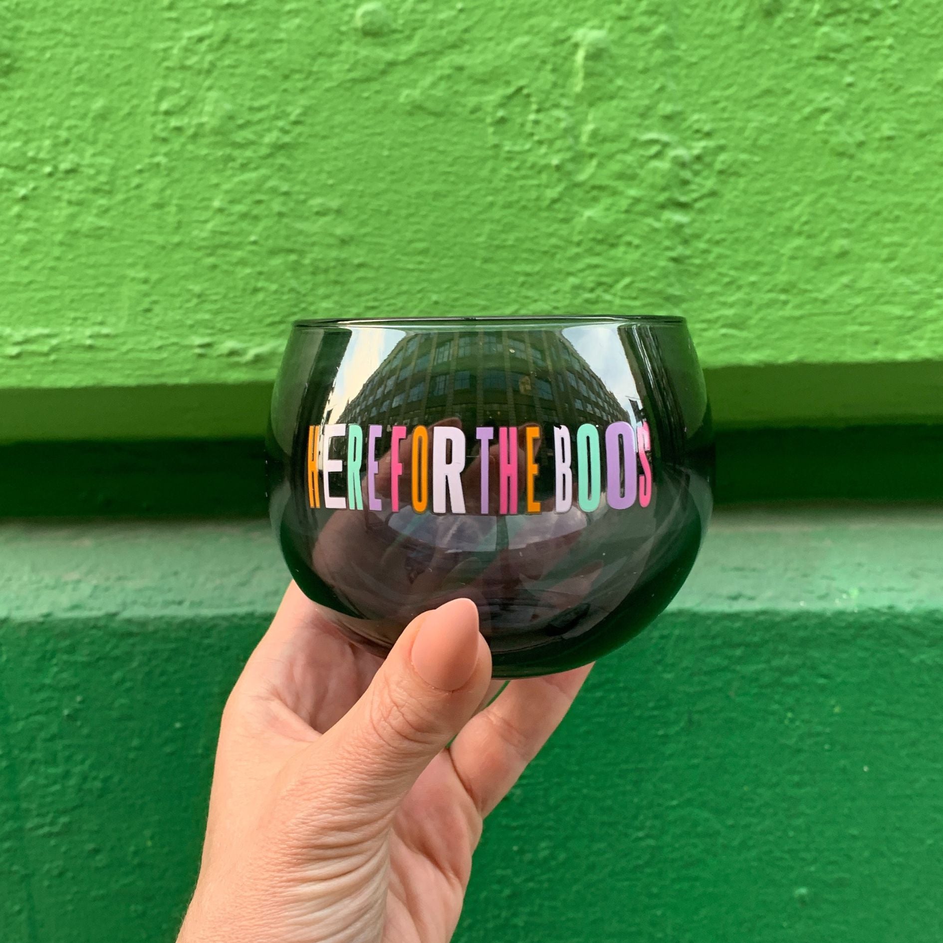 Here for the Boos Roly Poly Wine Glass in Tinted Black | Halloween Ghost Spooky 13 oz. Cup