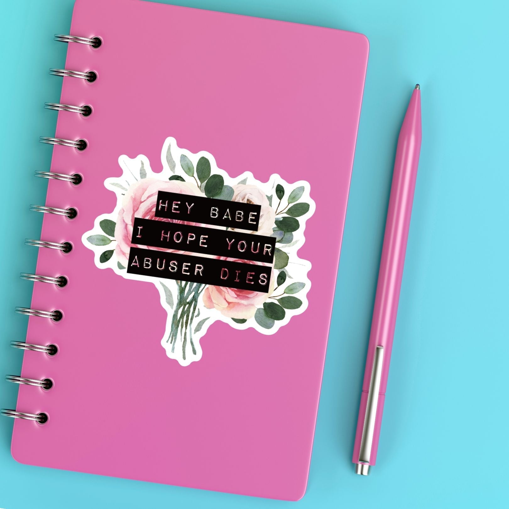 Reads: "Hey Babe I Hope Your Abuser Dies" on a beautiful floral background.