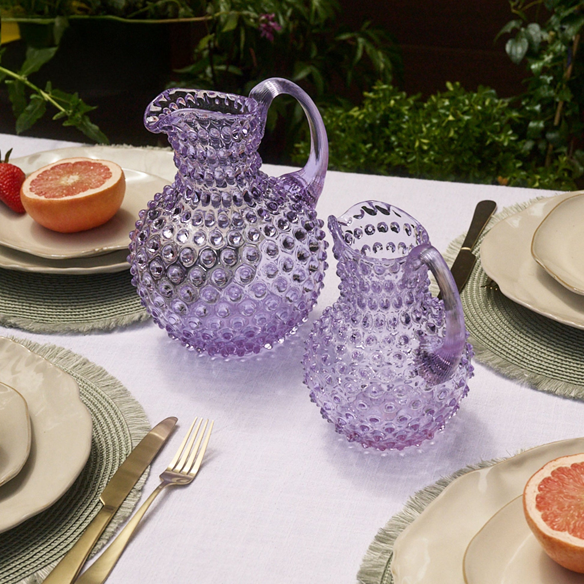 Our 1-liter Hobnail Creamer Jug seamlessly blends beauty and functionality. With its intricate texture and radiant finish, it adds a sophisticated touch to any table. Perfect for serving your favorite beverages or as an elegant décor piece, this jug reflects the timeless artistry of Maure’s glassware collection.