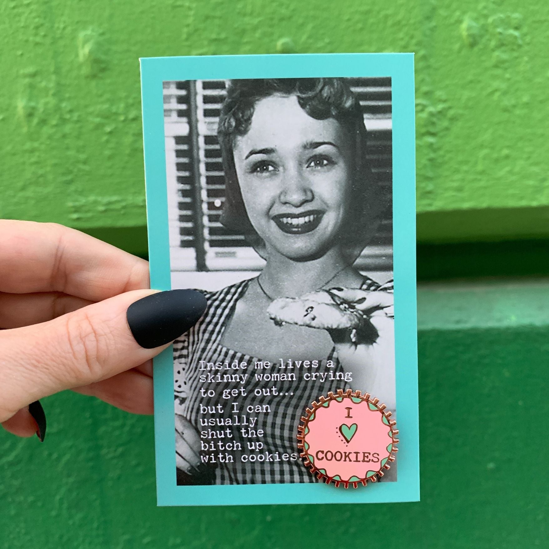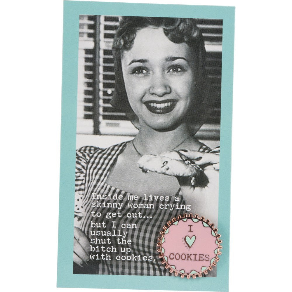 Comes packaged on a thoughtfully-coordinated vintage photograph card reading "Inside Me Lives A Skinny Woman Crying To Get Out... But I Can Usually Shut The Bitch Up With Cookies."