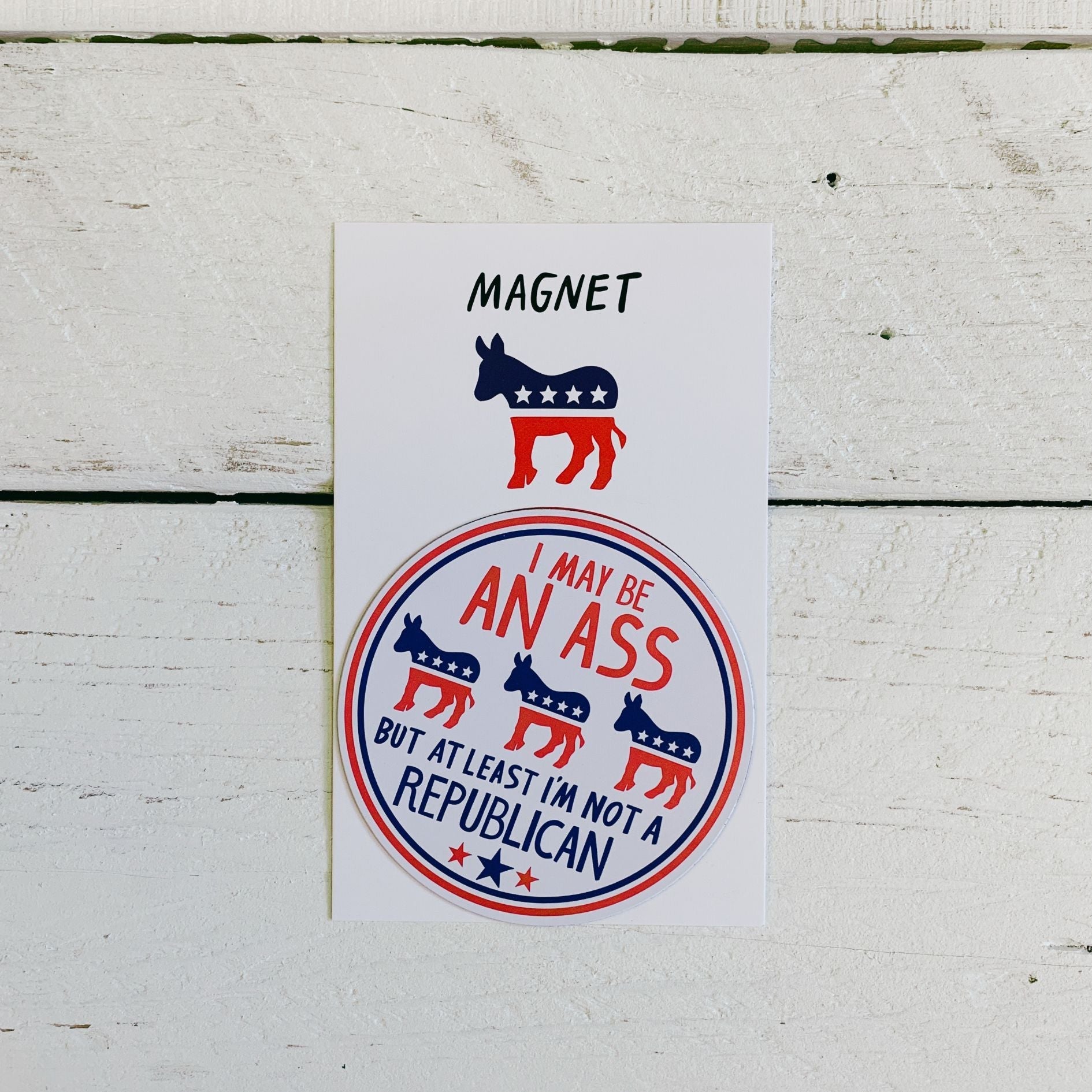 A magnet featuring a patriotic design and "I May Be An Ass But At Least I'm Not A Republican" sentiment on a white palette. Magnet is waterproof, UV protected, and ultra-strong.
