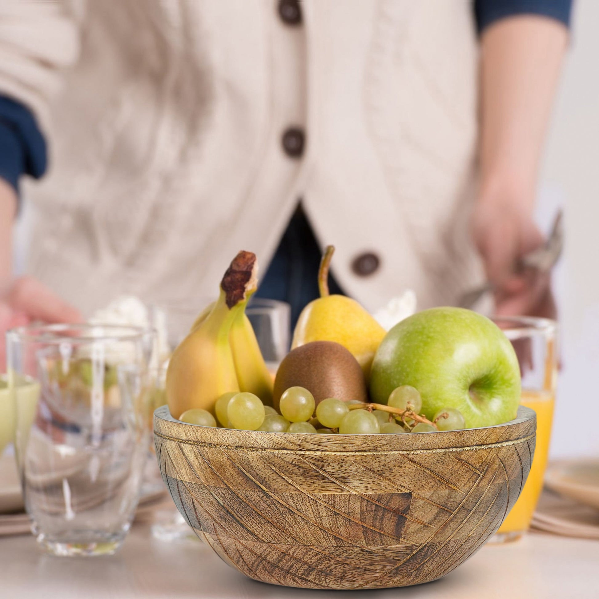 Elevate your delightful feast with our handmade mangowood bowls. These come in a modern design and feature 3 felt pads underneath the surface that ensure smooth stability and protection. These exquisite mangowood bowls blend with any decor or style. They are carefully hand-carved from premium mangowood, ensuring exquisite craftsmanship. Built to be durable and long-lasting, these bowls are ideal for gifting and seamlessly complement any dining room decor Their timeless appeal makes them a perfect bowl for both classic homes and farmhouse-style settings.