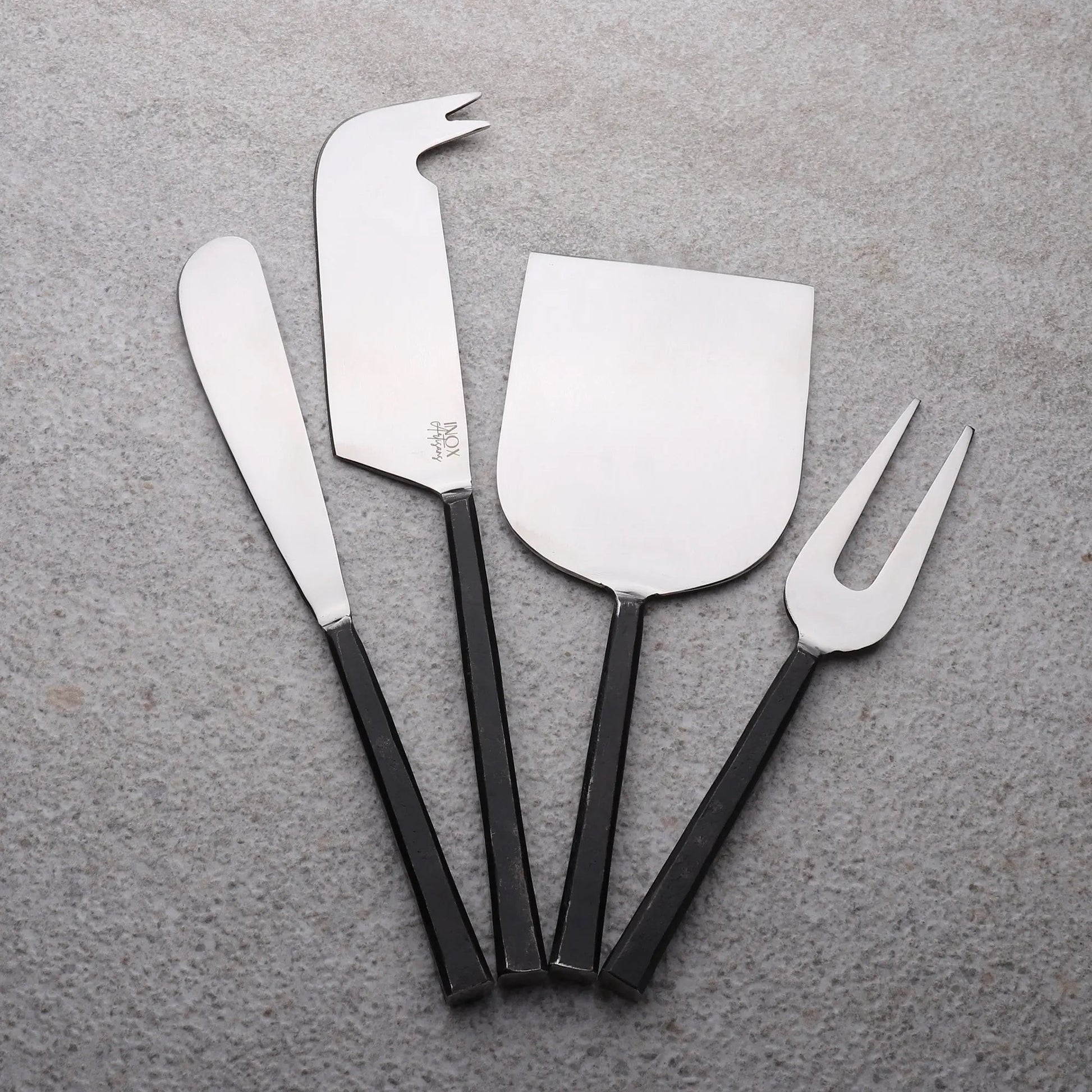 Our Jason Black Cheese Knives 4 Pc. Set showcases sleek square black handles contrasted by mirror-polished utensils. Ideal for cheese enthusiasts and for those who love to entertain from home, these artisan-crafted cheese knives will elevate your cheese and charcuterie platters.