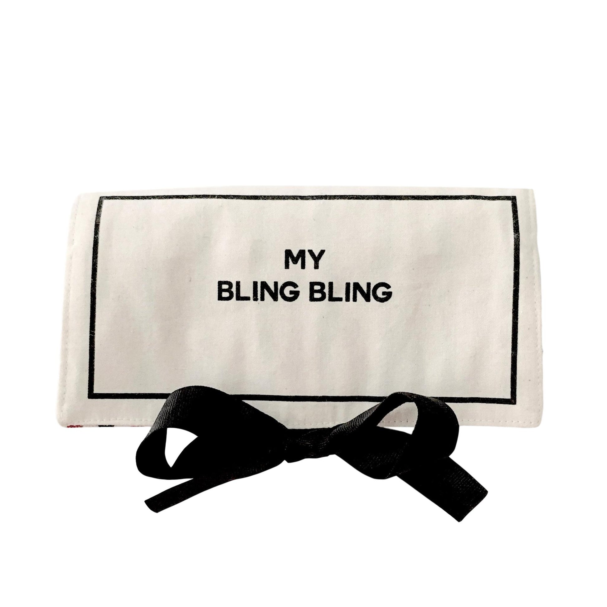 A soft jewelry organizer designed to keep jewelry neatly organized at home or while traveling. Interior sections help protect delicate pieces. Finished in Cream with a timeless look. This product comes with print "MY BLING-BLING" print on the front. It can also be personalized with a monogram or embroidery.