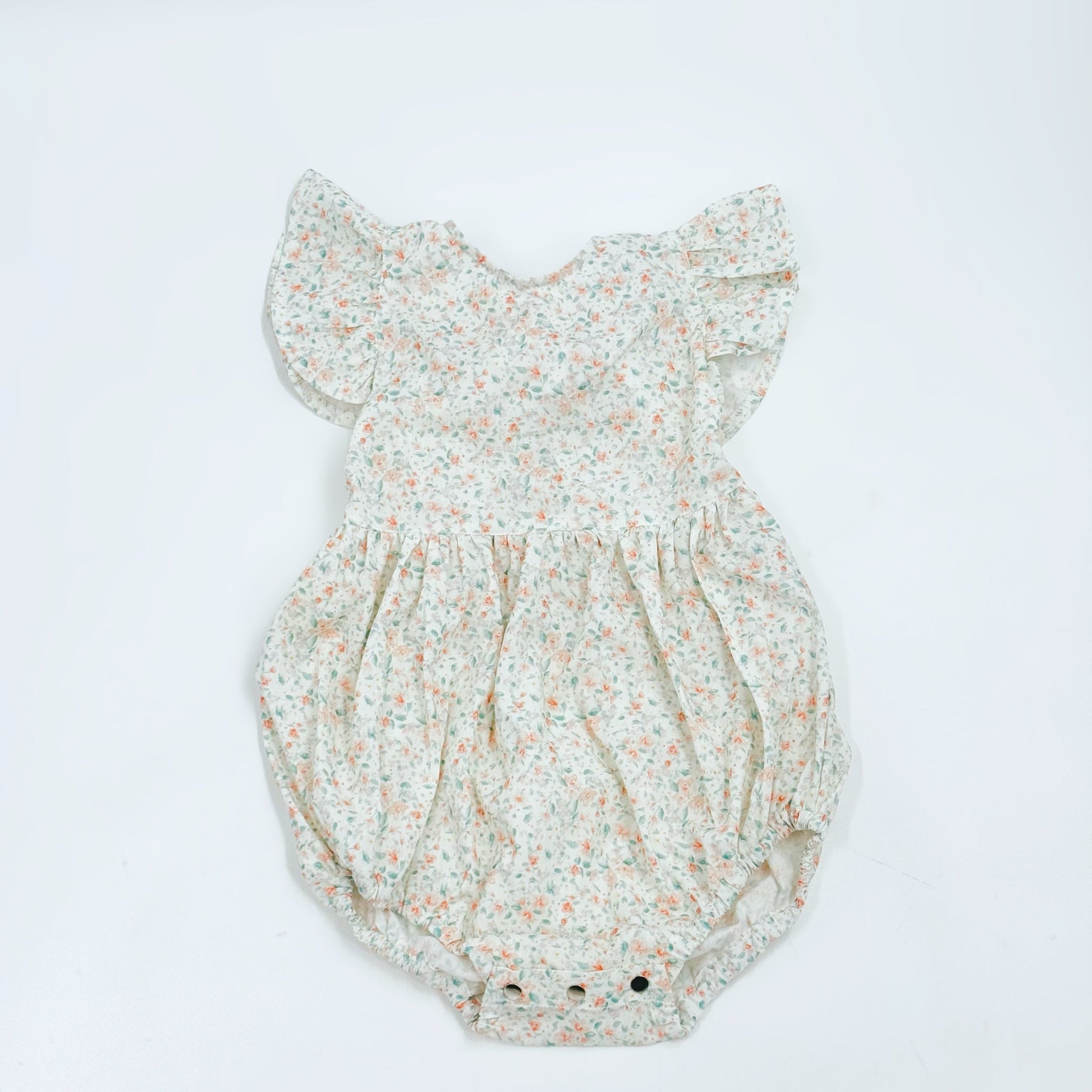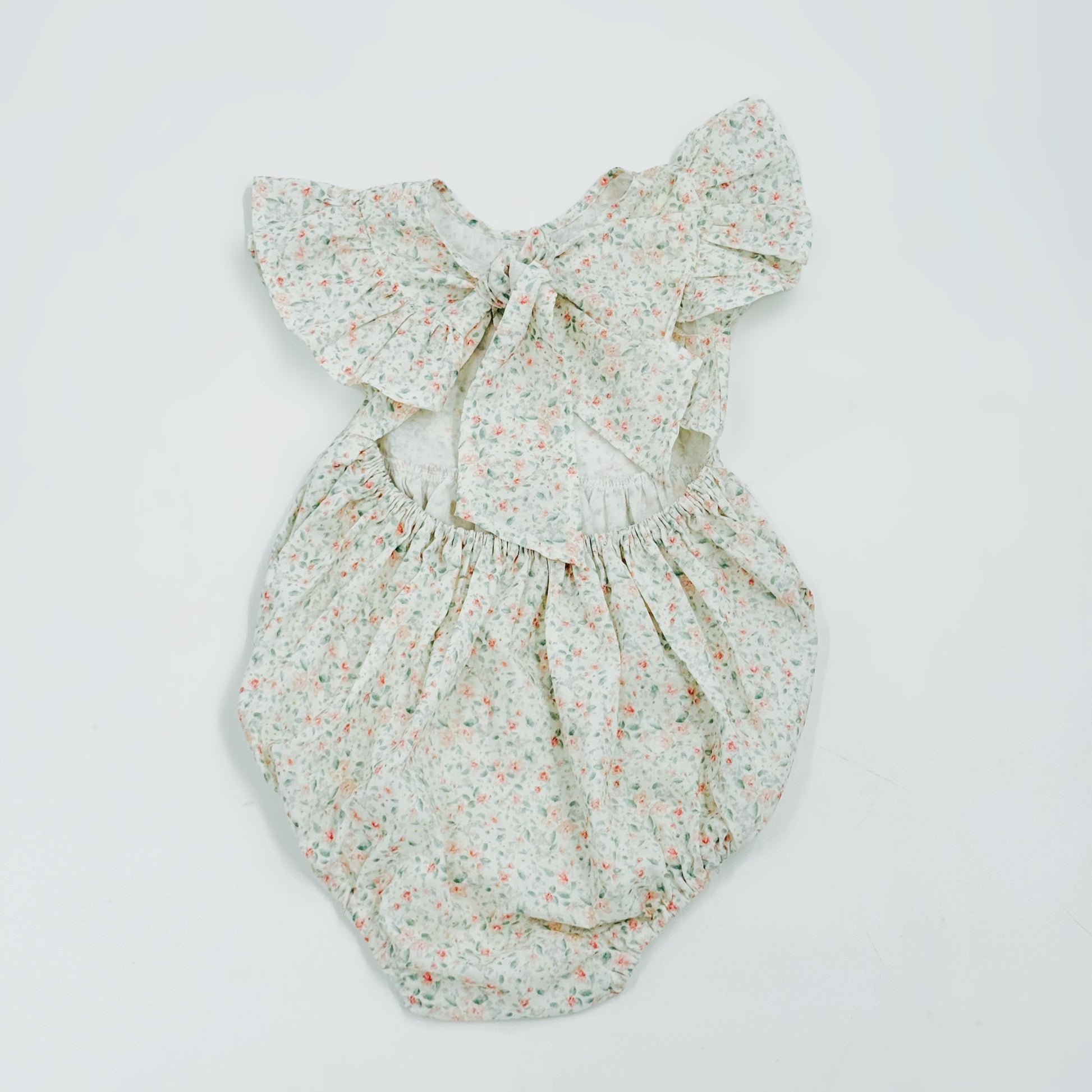 The Josie Romper is made with organic cotton fabric, featuring flutter sleeves, elastic leg openings, and a snap bottom for effortless changing. The tie back closure adds a touch of style and functionality.