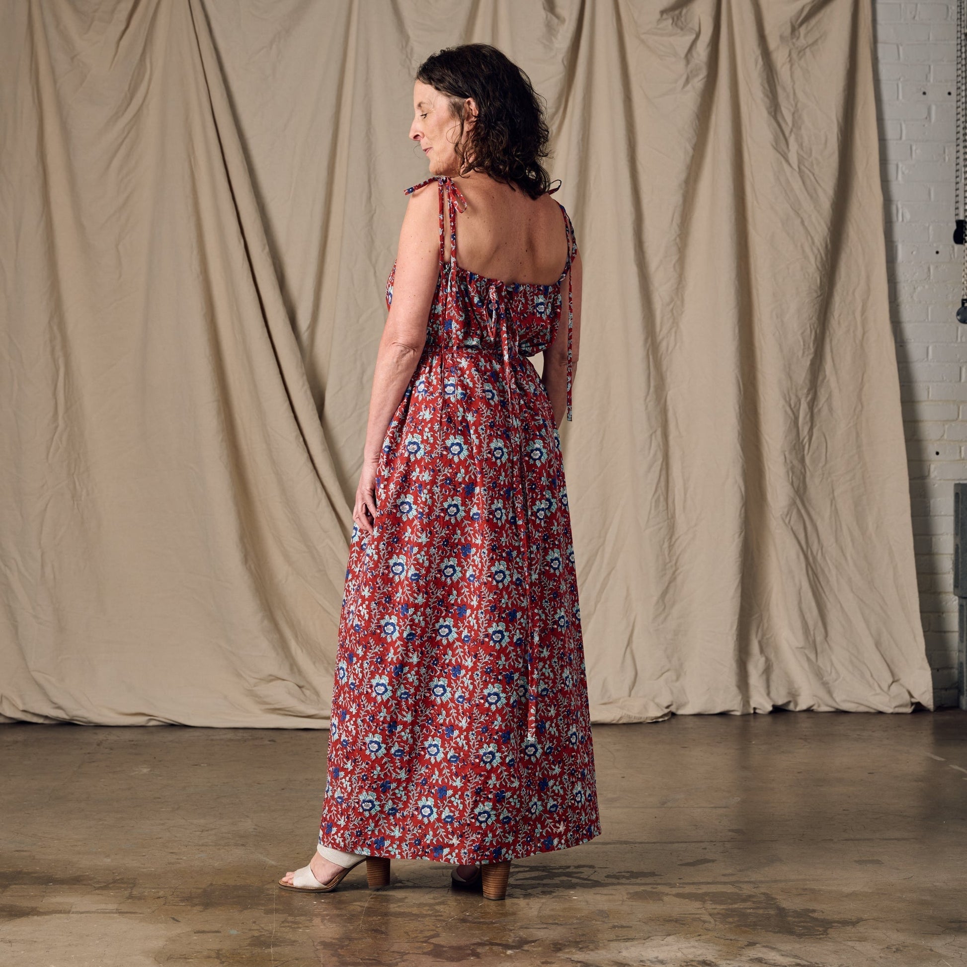 Breezy and beautiful, this free-flowing maxi dress features a bold red and teal floral print on soft, lightweight cotton. Designed with adjustable spaghetti straps, a cinchable ribbon neckline and a matching fabric belt, it flatters a range of body types with ease and elegance. Your go-to for sunny days or relaxed, casual nights. Our garments are thoughtfully designed to have an adjustable, "one size fits most" fit, allowing for less waste in production while promoting individual comfort. As always, each piece is ethically and sustainably made. A Ten Thousand Villages Exclusive handcrafted in India.