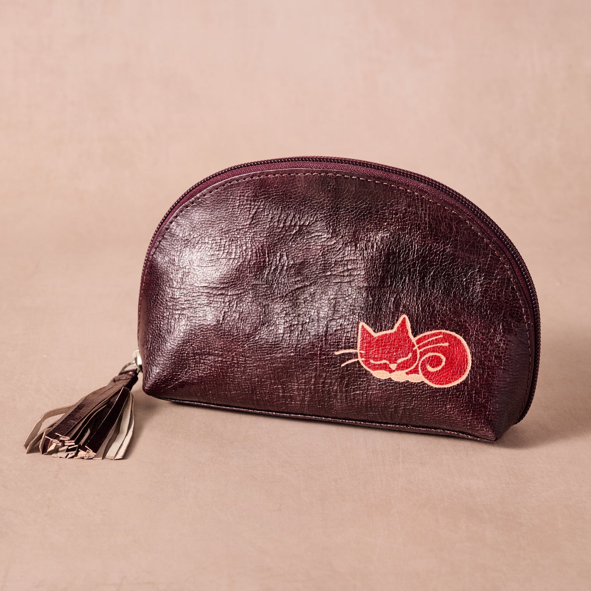 Travel with a touch of whimsy with this delightful burgundy leather drop-in bag featuring a charming red and cream cat curled in the corner. Made from supple goat leather, a by-product of the meat industry that might otherwise go to waste. The structured base and curved silver zipper offer both form and function while the tassel detail adds playful flair. Lined with black cotton, it’s the purr-fect blend of character and craftsmanship. Handcrafted in India by the artisans of Craft Resource Center Pvt. Ltd. (CRC), a guaranteed Fair Trade Organization creating sustainable income opportunities for marginalized communities by blending traditional skills and ethical practices with globally competitive design, quality and innovation while preserving the dignity of labor and empowering artisans through fair trade, technology and skill development. Coordinates with 6868960.