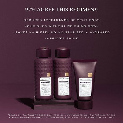 *Based on an 8-hour clinical study of 30 hair tresses with UV damage, heat + chemical services using the Peptide Restore Shampoo, Conditioner, and Leave-In Treatment regimen