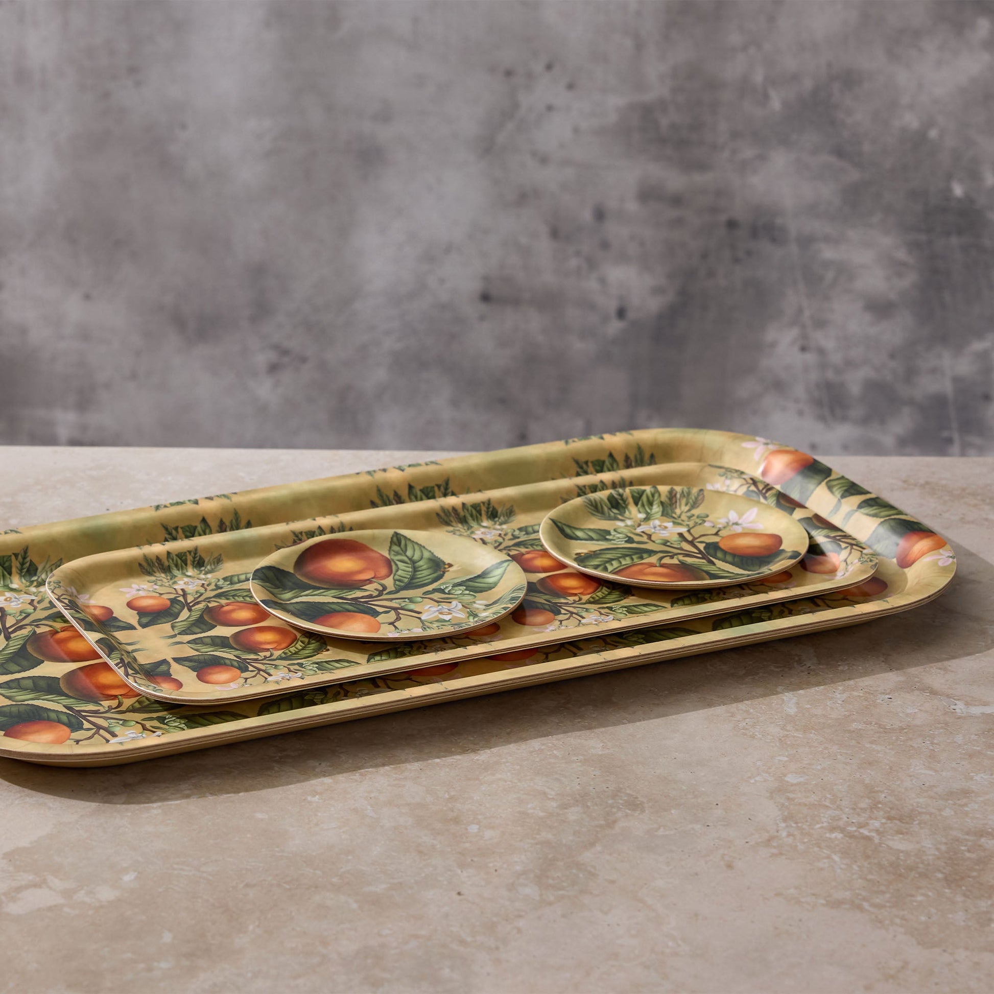 Elevate your decor with our Kumquats Narrow Birchwood Tray, featuring a vibrant and lifelike depiction of the kumquat tree in full bloom. The delicate petals and rich, golden fruit are complemented by a bee gently resting on a leaf, its wings dusted with pollen. This design captures the essence of a sunlit grove, where nature’s smallest details come together in perfect harmony. Crafted from sustainably sourced birchwood, this tray is more than just a functional piece—it’s a quiet nod to nature’s artistry. Each tray is adorned with a unique print, adding a subtle layer of character that enhances its minimalist appeal. Whether used for serving or as a decorative accent, this tray effortlessly elevates any setting.