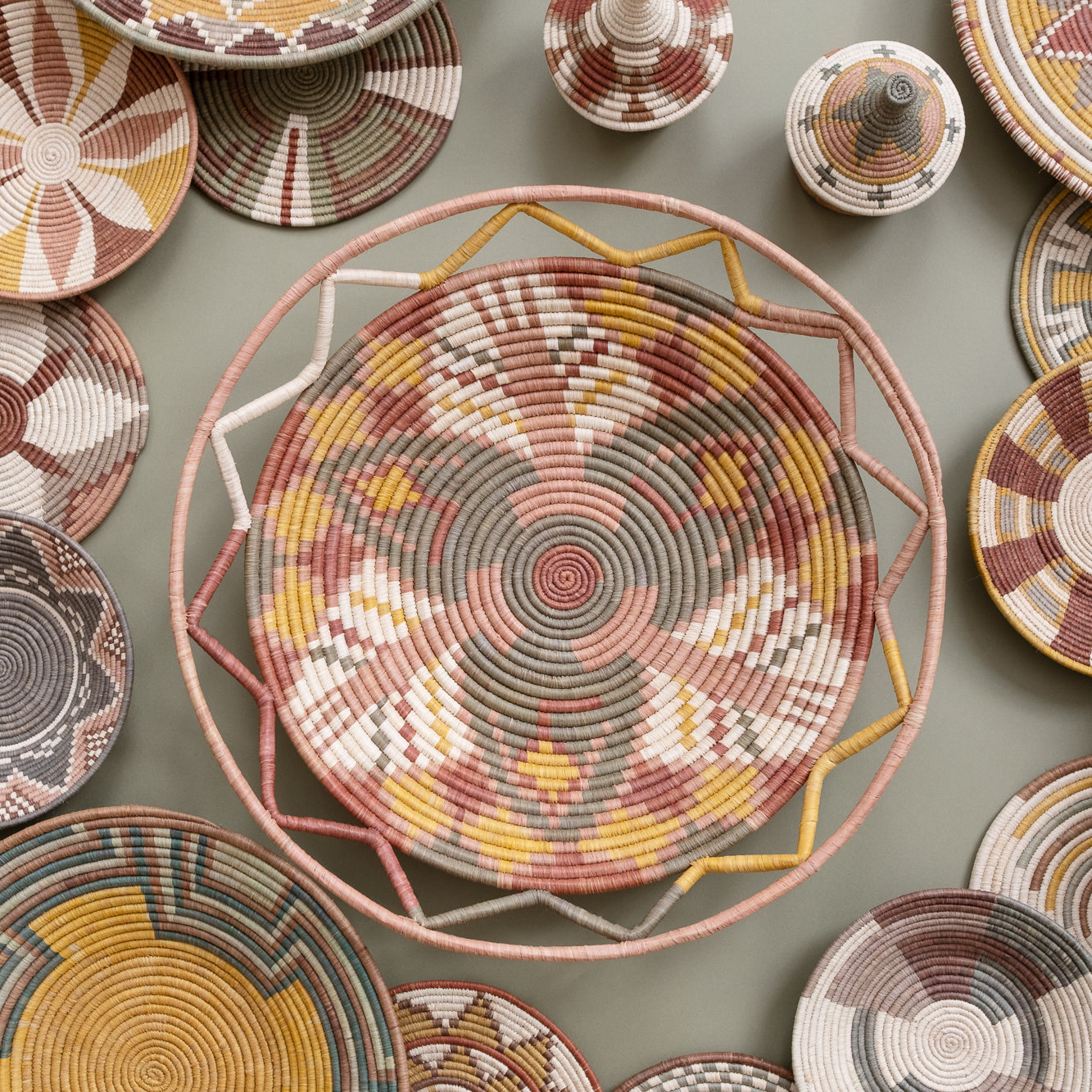 • The hand-dyed raffia is twisted and wrapped around coils of banana fibers, creating structure and intricate designs.