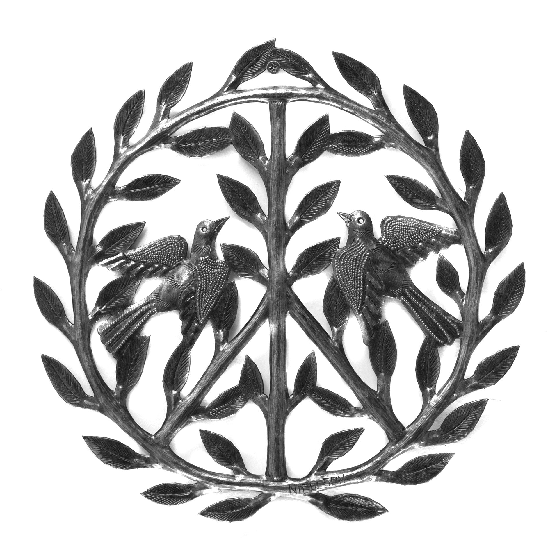 12" x 12" Fast becoming a Haitian metal art classic, this peace symbol is adorned with leaves and birds. Created by Nicolson Mathieu.
