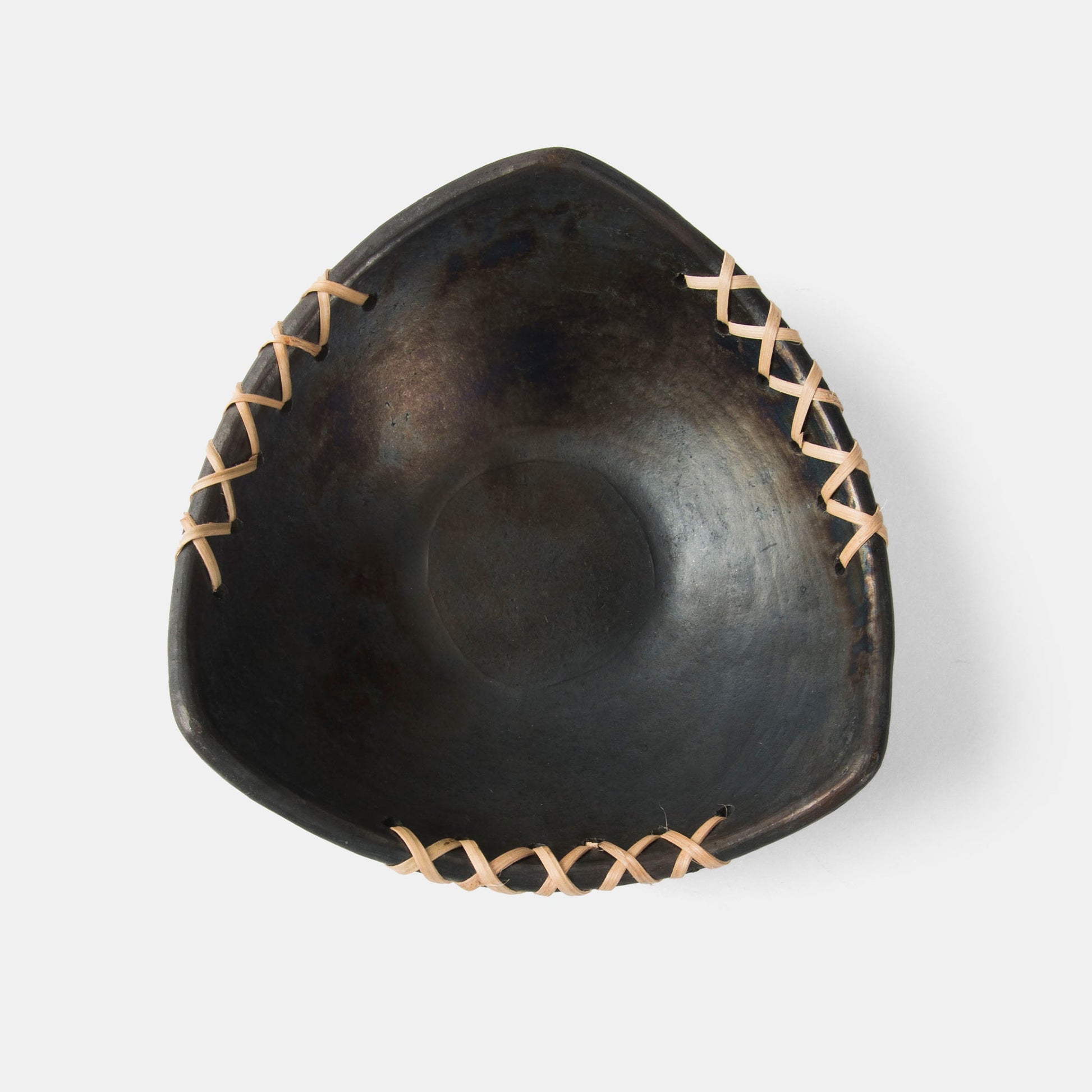 Serve little delights in this stylish trigonal clay nut bowl enhanced by beautiful bamboo detail.