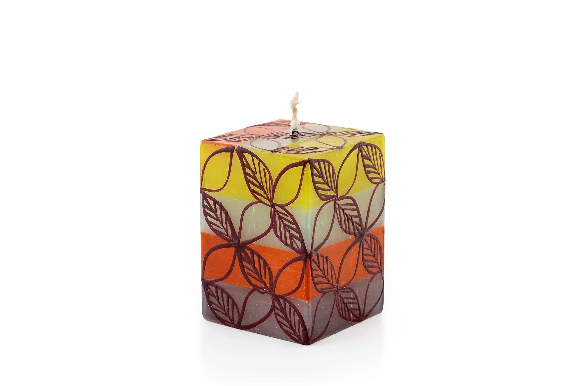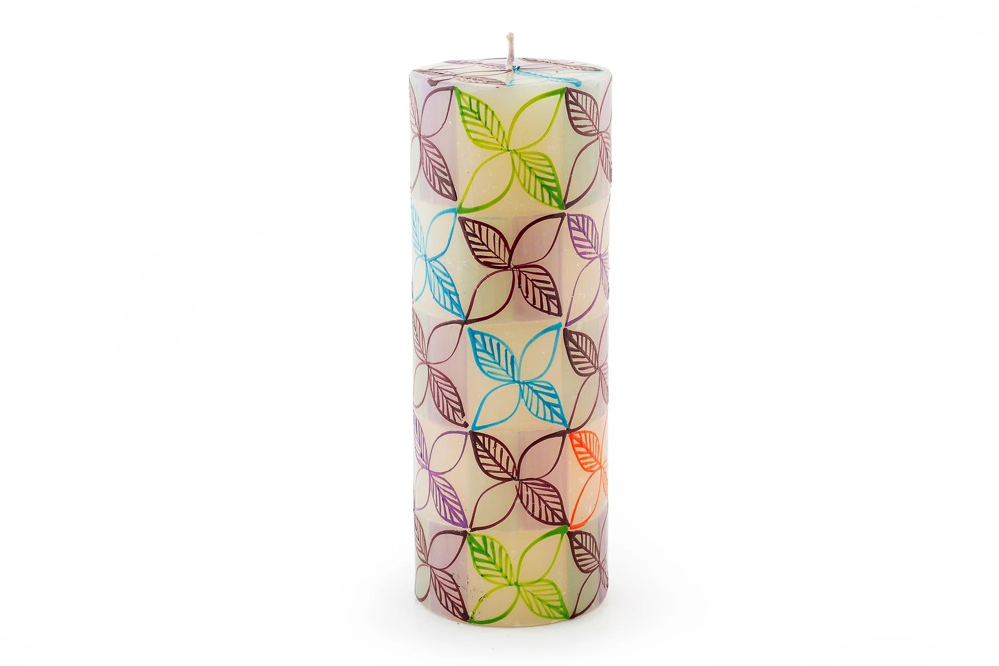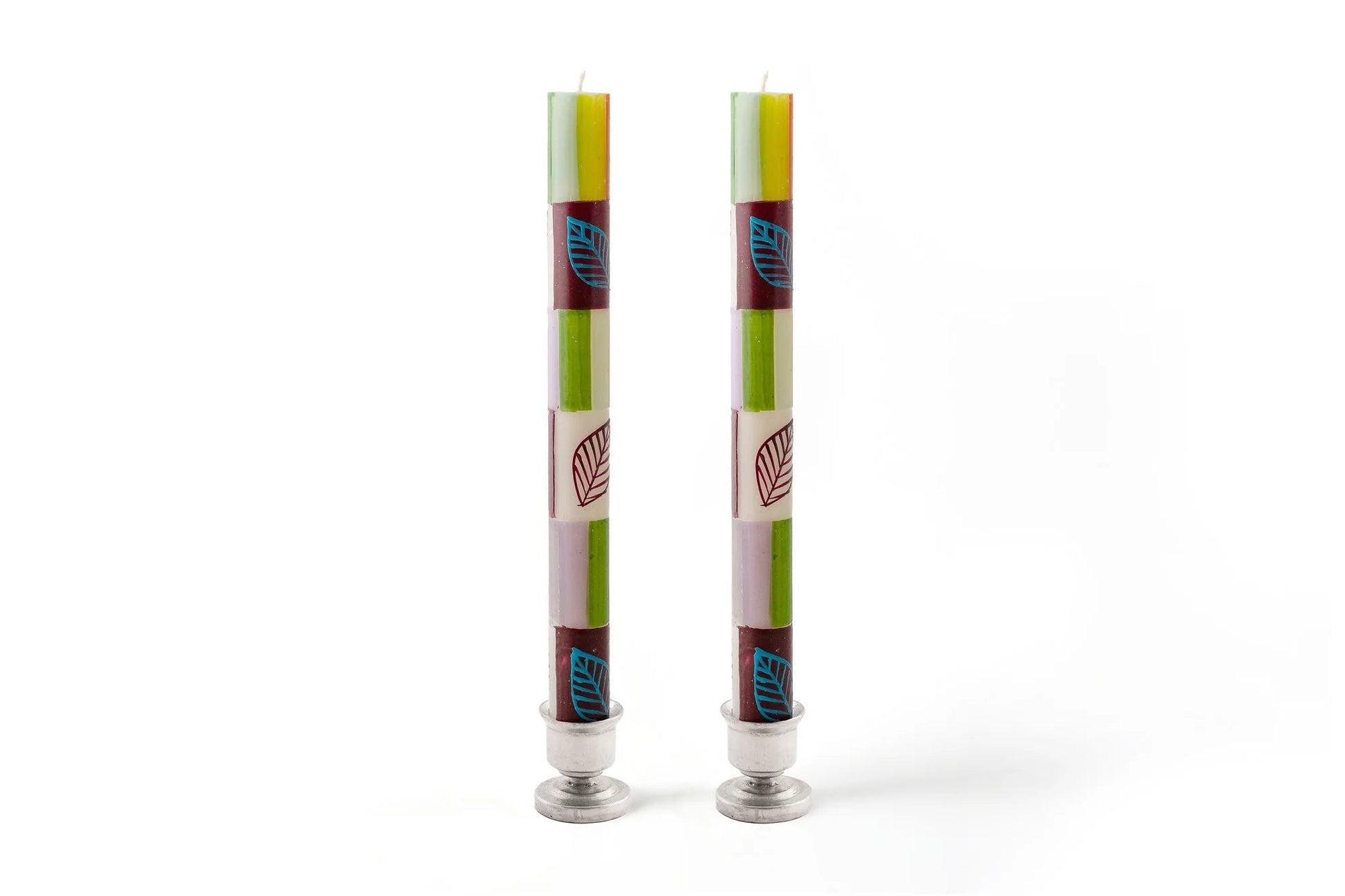 Greens, blues, purples and flowers woven together in these lively African designs! *Lovingly hand poured and hand painted in South Africa. *Crafted primarily by single mothers from the local rural community. *On average, the artisans support an extended family of 12-15 people. PRODUCT DESCRIPTION: *Highest quality natural paraffin wax with 100% cotton wick *Unscented, smokeless, and free from added toxins *Tapers packaged as a matched pair *Each candle is uniquely made. Your delivered candle will likely appear slightly different from the website photo, but consistent with the theme of the collection. CANDLE CARE: *First burn time: 1-hour for every inch diameter *Wicks should always be cut to ¼” prior to lighting *Avoid drafts – they cause dripping! *Ensure candles are extinguished prior to leaving the room Learn more about the artisan hands that make these fair-trade products!