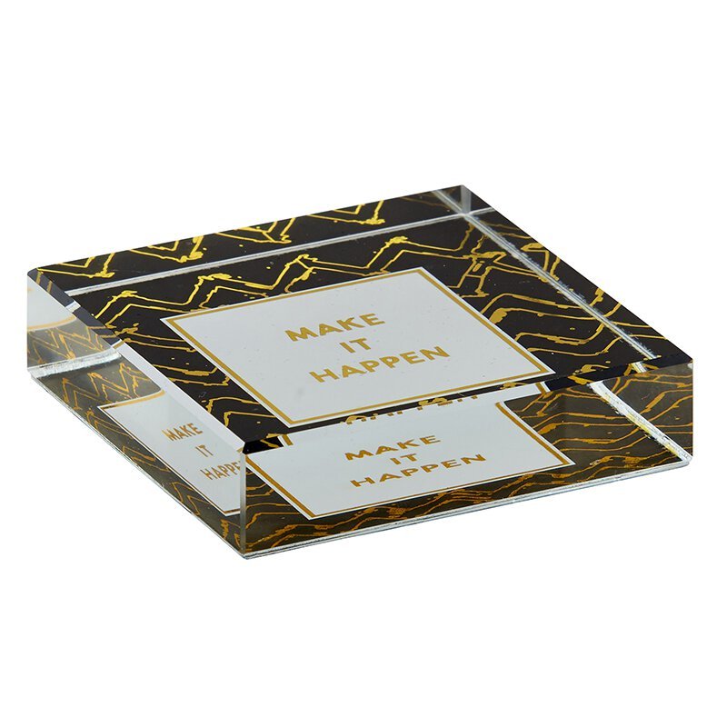 Square glass paperweight featuring 'Make It Happen' in metallic gold text.